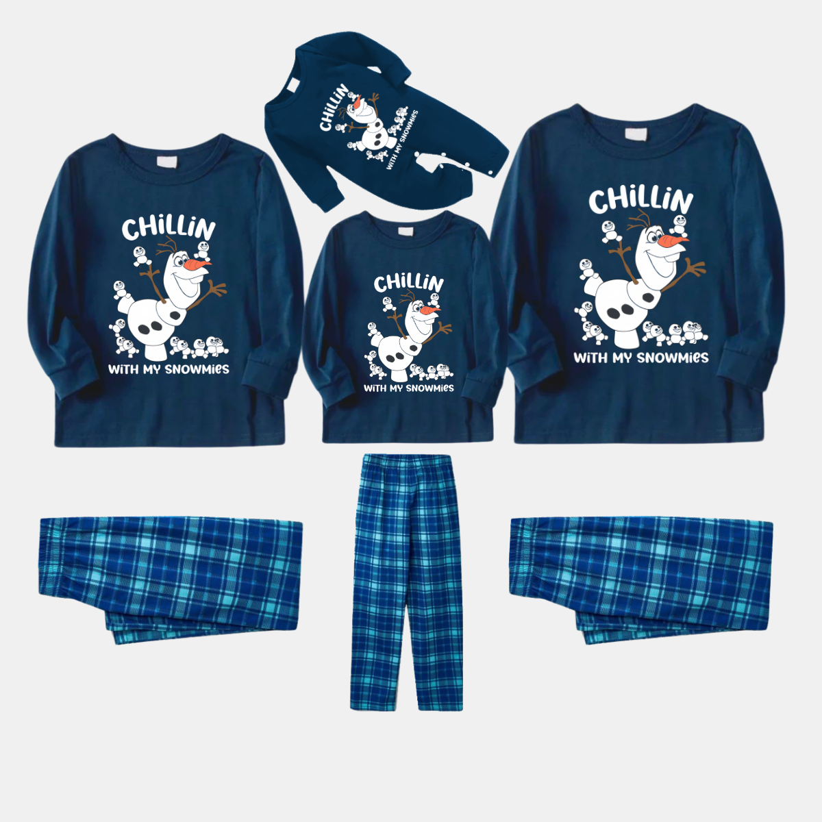 Navy & Sky Blue Plaid Christmas Pajamas Set with Snowman & "Chillin With My Snowmies" Print