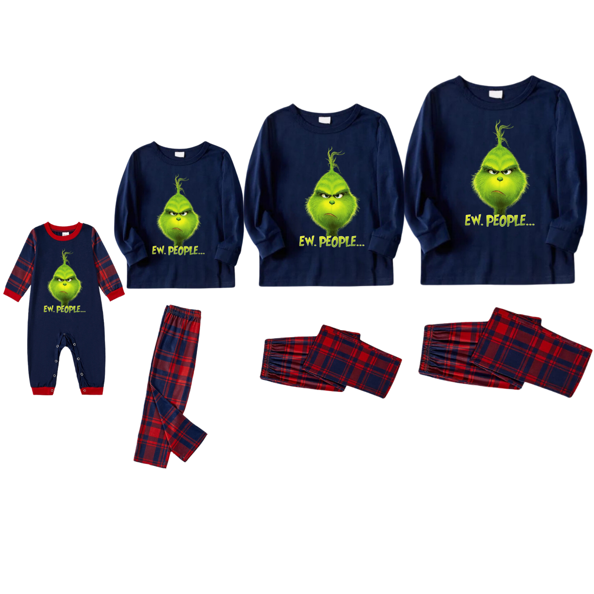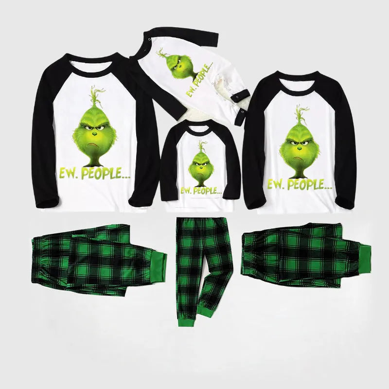 Christmas Cute Cartoon And 'Ew.People...' Letter Print Splice Contrast Top and Black and Green Plaid Pants Family Matching Pajamas Sets