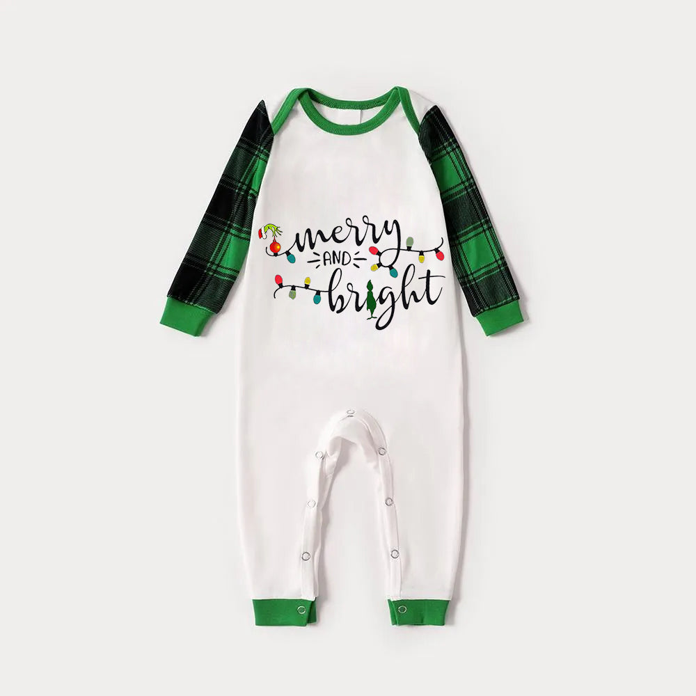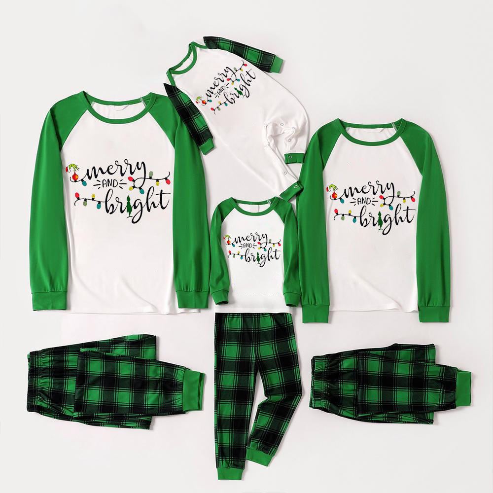 Christmas Cute Cartoon Bulb Print and 'Merry and Light’ Letter Print Casual Long Sleeve Sweatshirts Green Contrast Tops and Black and Green Plaid Pants Family Matching Raglan Long-sleeve Pajamas Sets