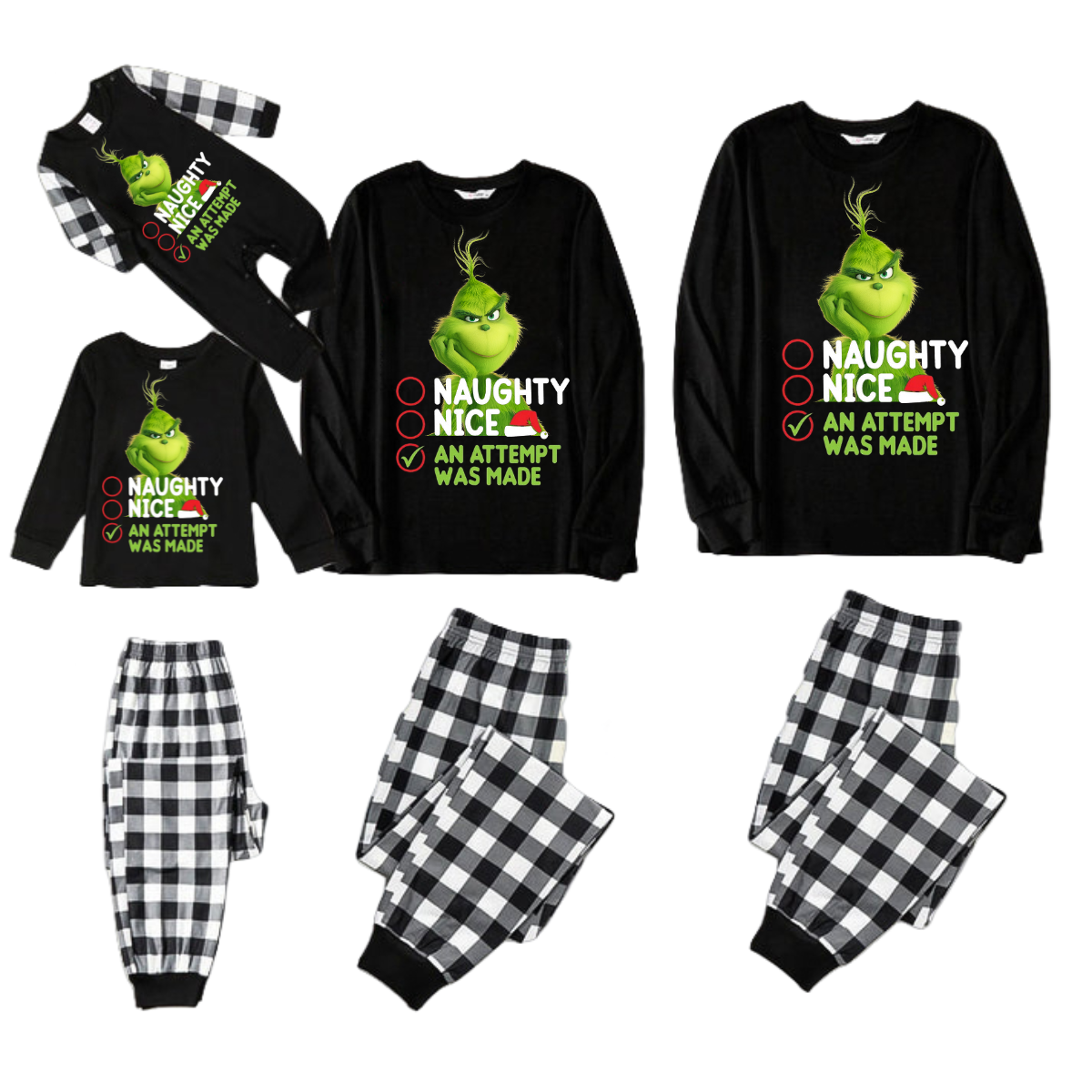 Funny Christmas Slogan Print Black Long Sleeve Top with Green & Red Plaid Family Matching Pajamas