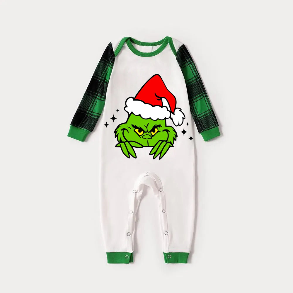 Christmas Hat Cartoon Print Splice Contrast Top and Black and Green Plaid Pants Family Matching Pajamas Sets