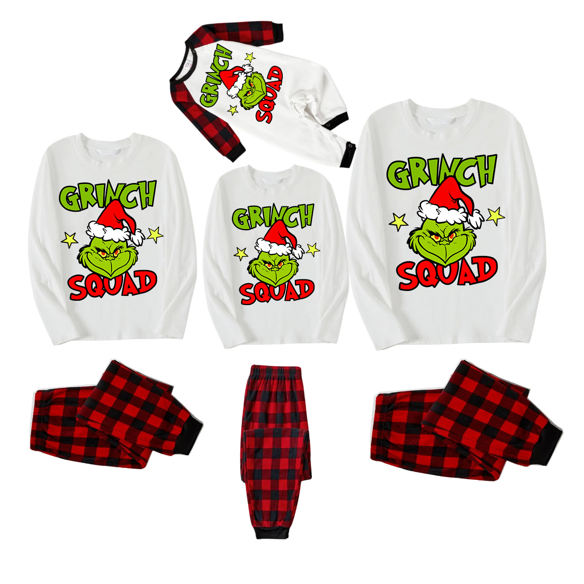 Christmas Tree of Shape with Stars and "Merry Christmas" Artistic Font White Long Sleeve Top with Red & Green Plaid Pants Family Matching Pajamas