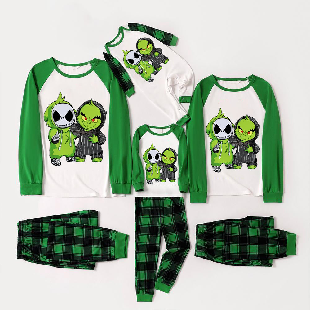 Cute Cartoon Pattern and Slogan Text Printed Black and Green Plaid Christmas Matching Pajamas