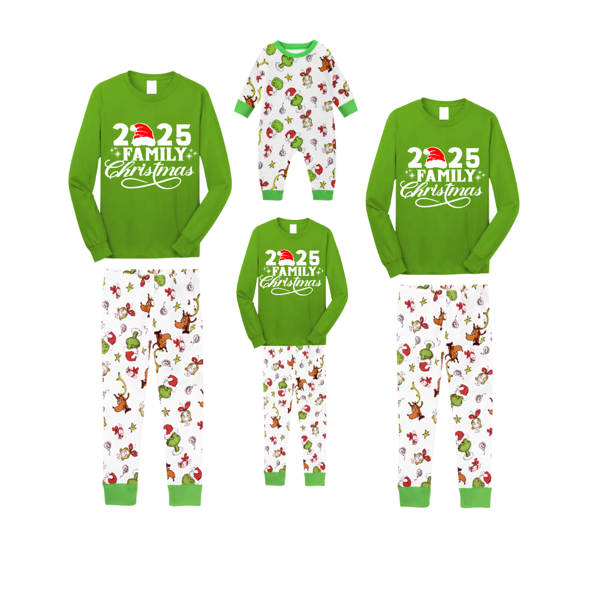 2025 Our Family Christmas Matching Pajamas - Green with Santa & Reindeer Pattern
