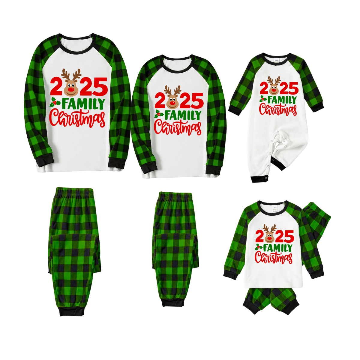 2025 Reindeer Family Christmas Family Pajamas Set - White Top / Green Black Plaid Pants / Green Black Plaid