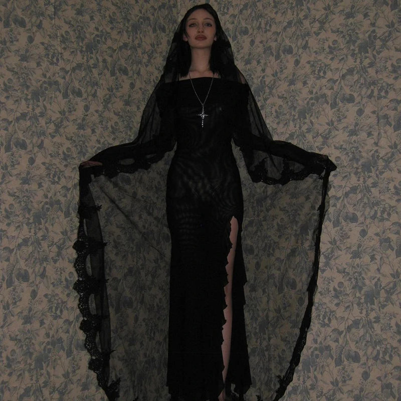 Gothic Mesh Splice Aesthetic High Split Batwing Sleeve Dress