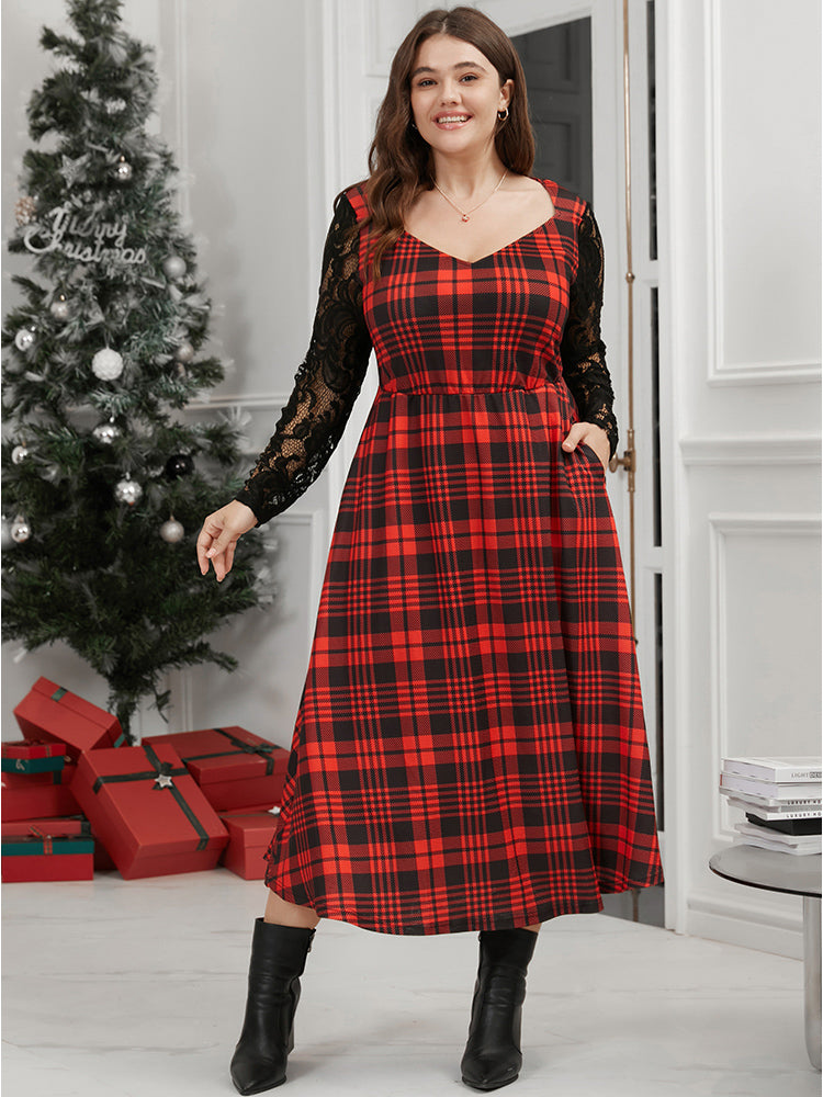 Plaid Pocket Contrast Lace V Neck Midi Dress 1007