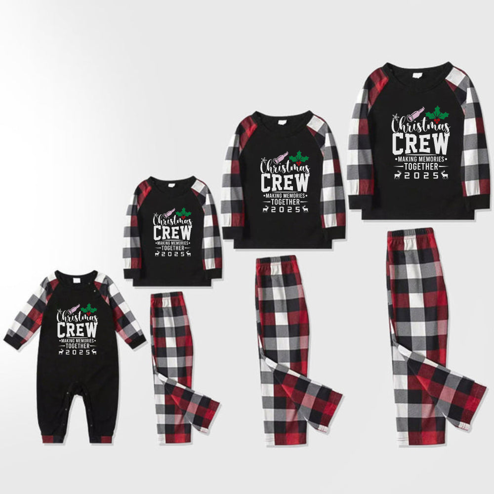 Black and White Plaid Short Sleeve Christmas Family Pajamas Set With Colorful "Christmas Crew Making Memories Together" Print