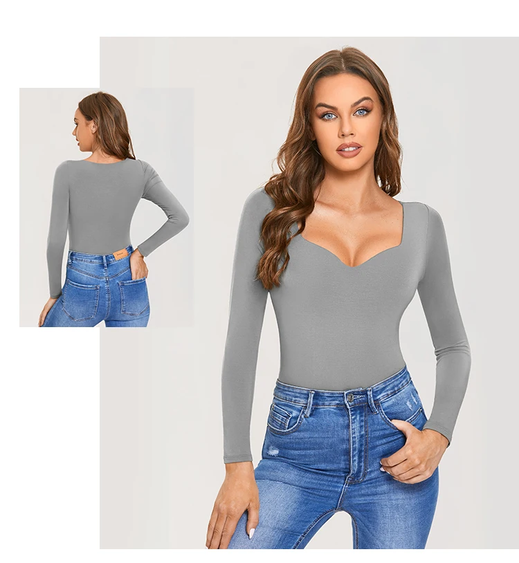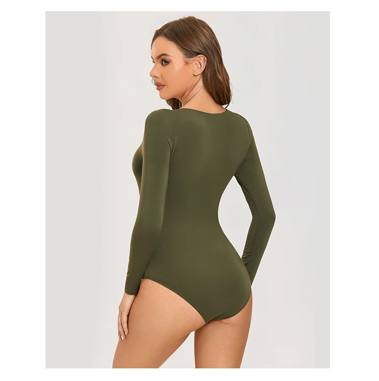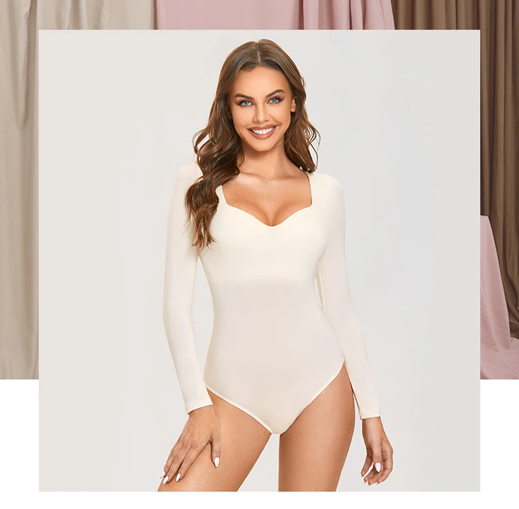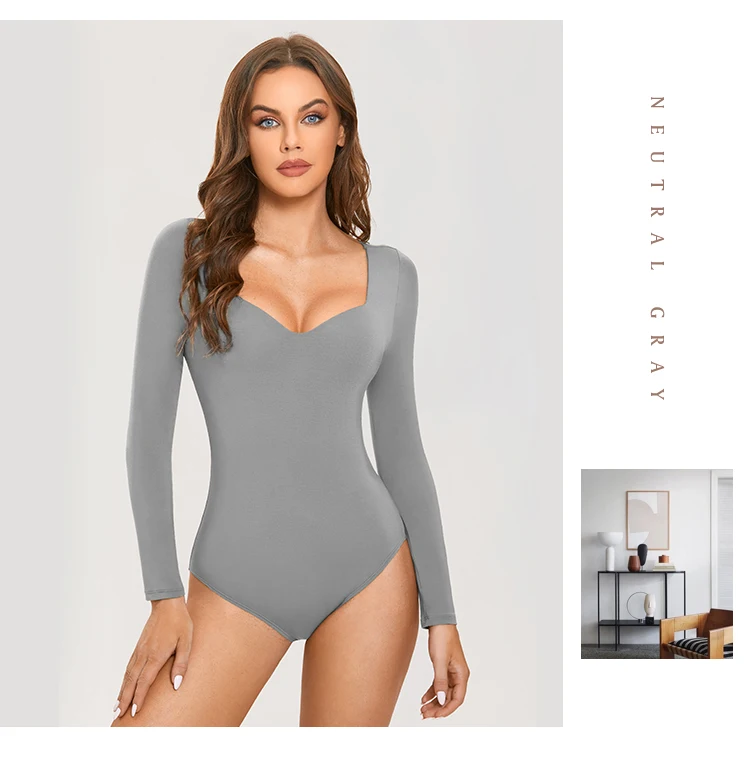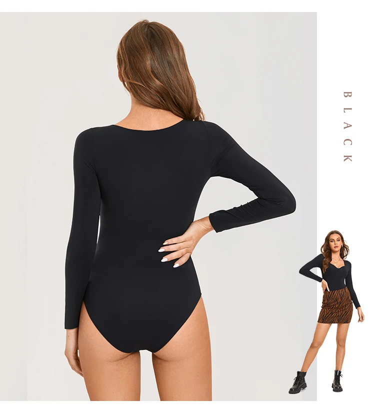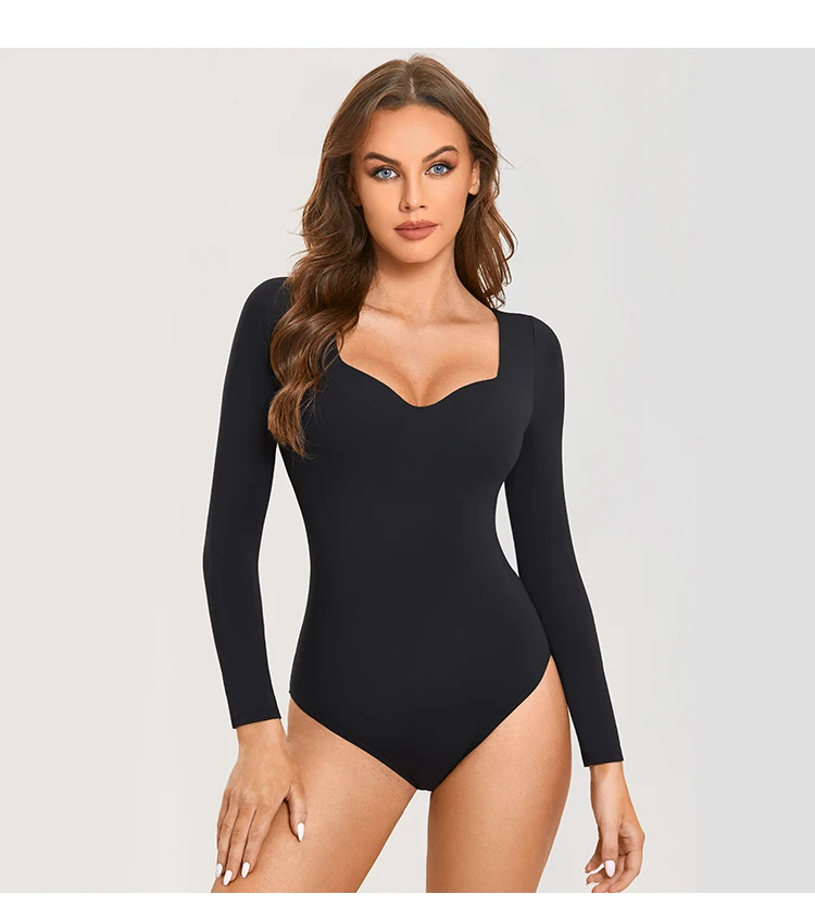 Sexy Deep V Neck Long Sleeve Bodysuit with Built in Bra