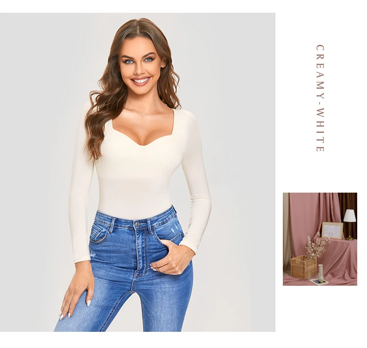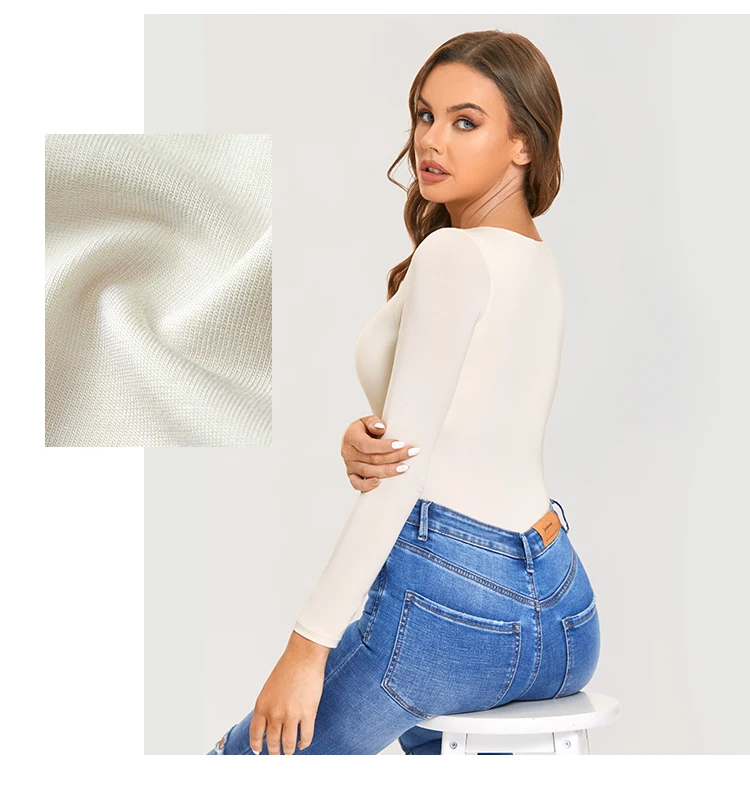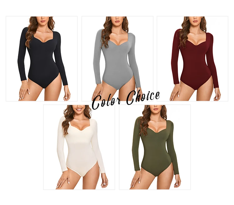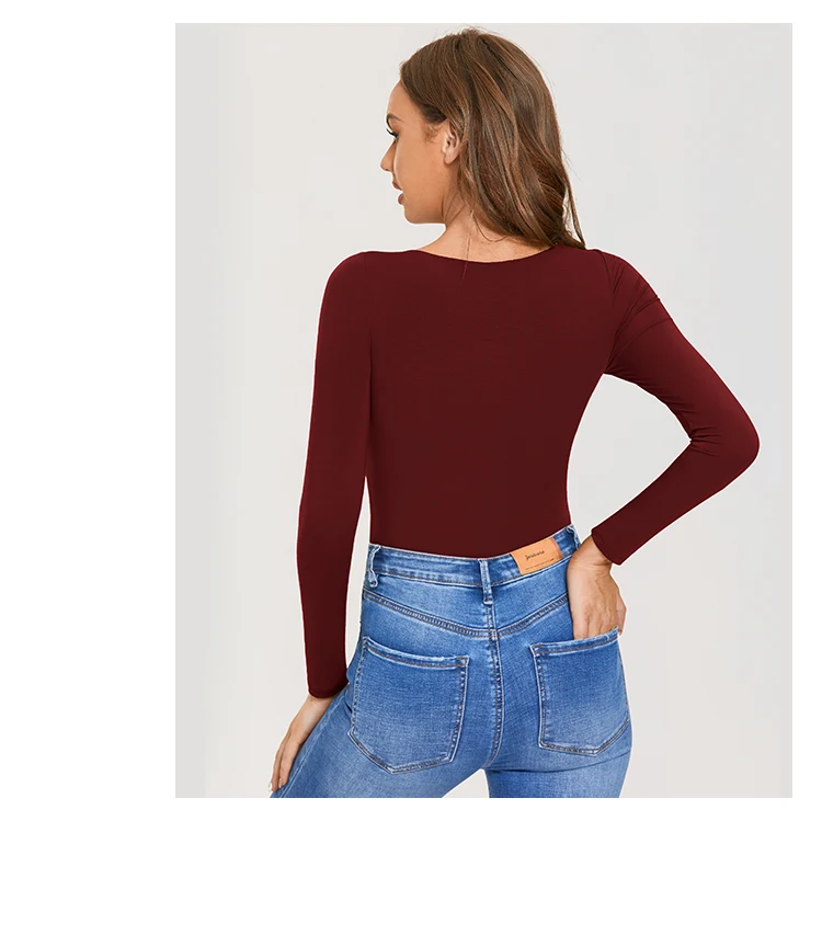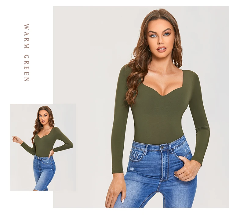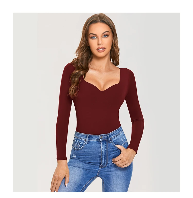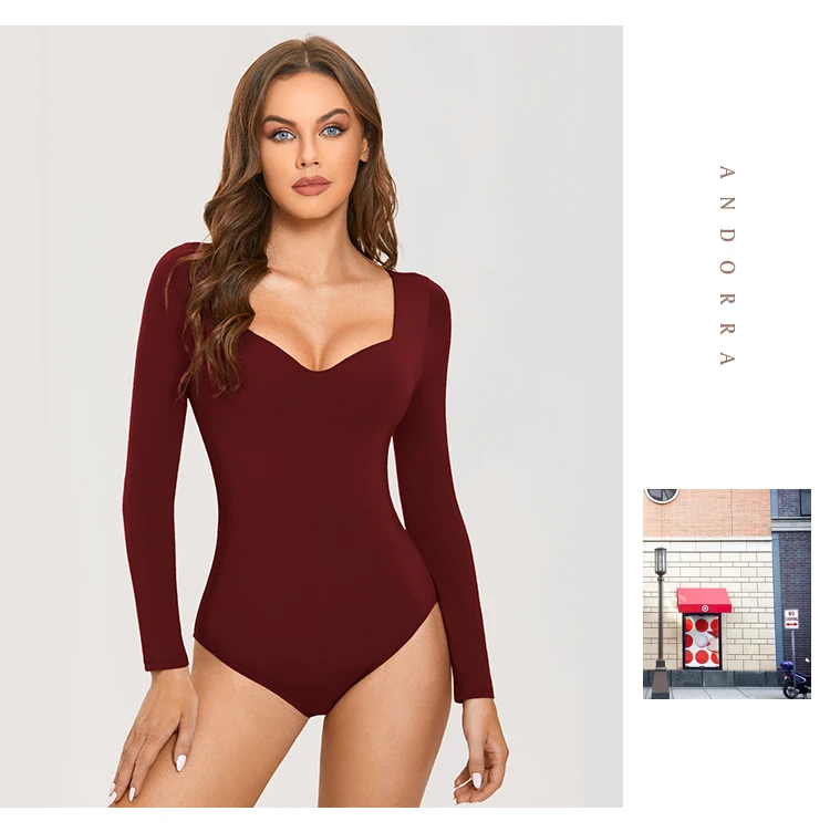 Sexy Deep V Neck Long Sleeve Bodysuit with Built in Bra