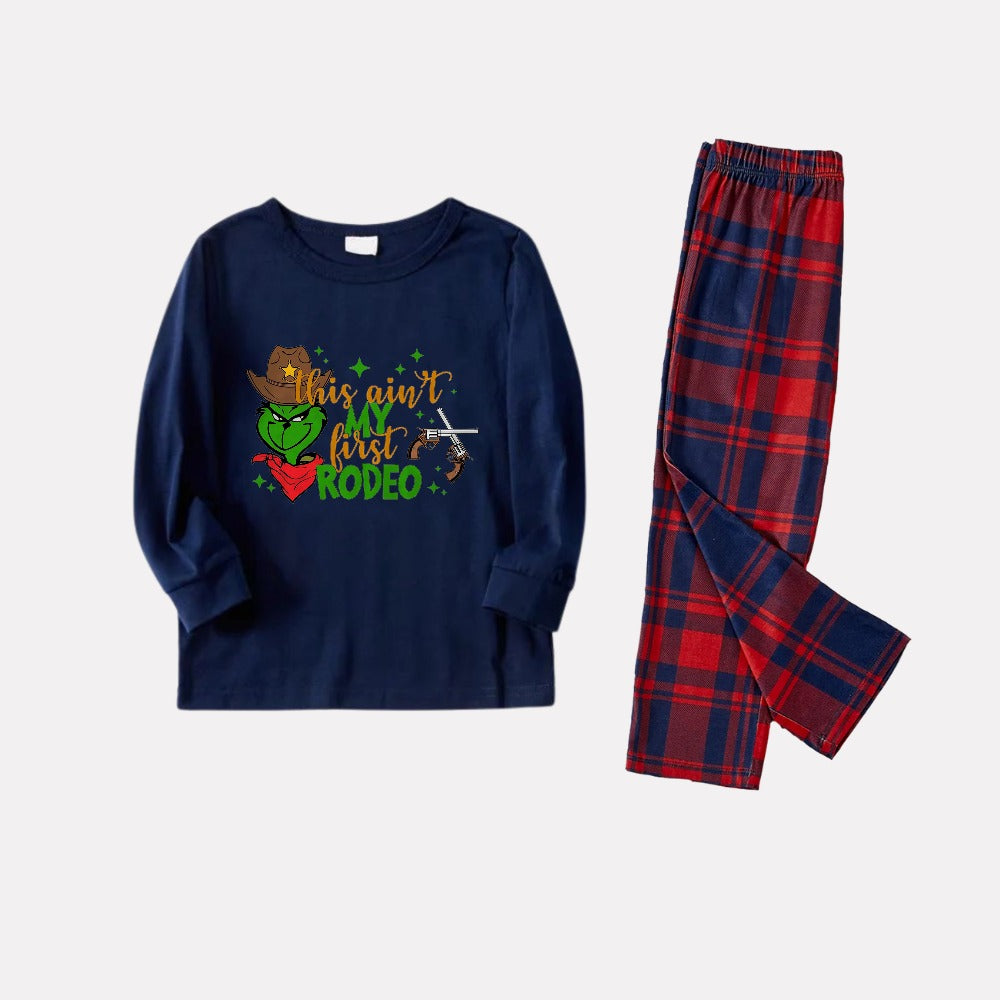 Christmas Family Matching Pajamas-Navy & Red Plaid Pjs Set with "This Ain't My First Rodeo" and Grinch Cartoon Print