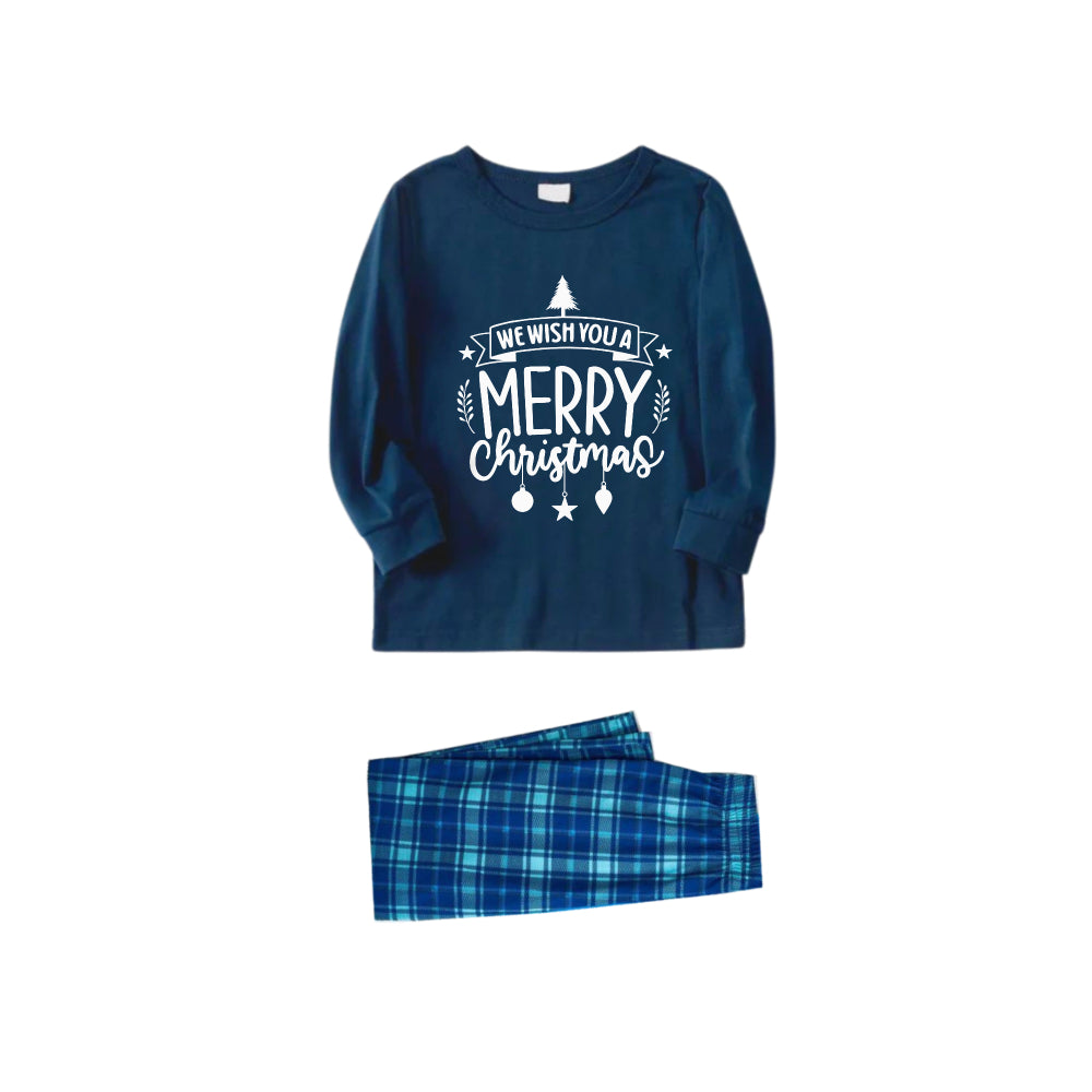 Christmas Family Matching Pajamas-Navy & Sky Blue Plaid Pjs Set with "We Wish You A Merry Christmas" Slogan Print