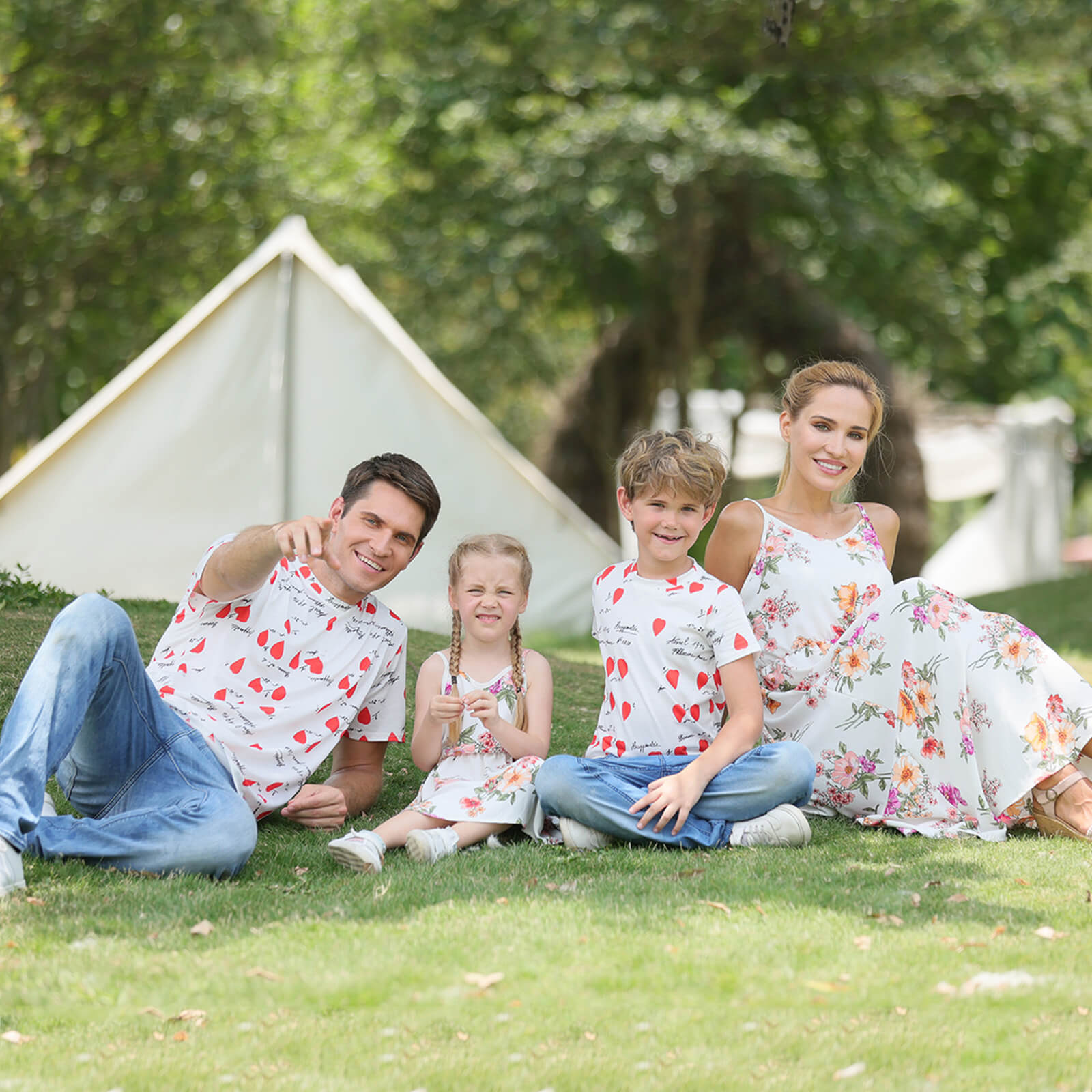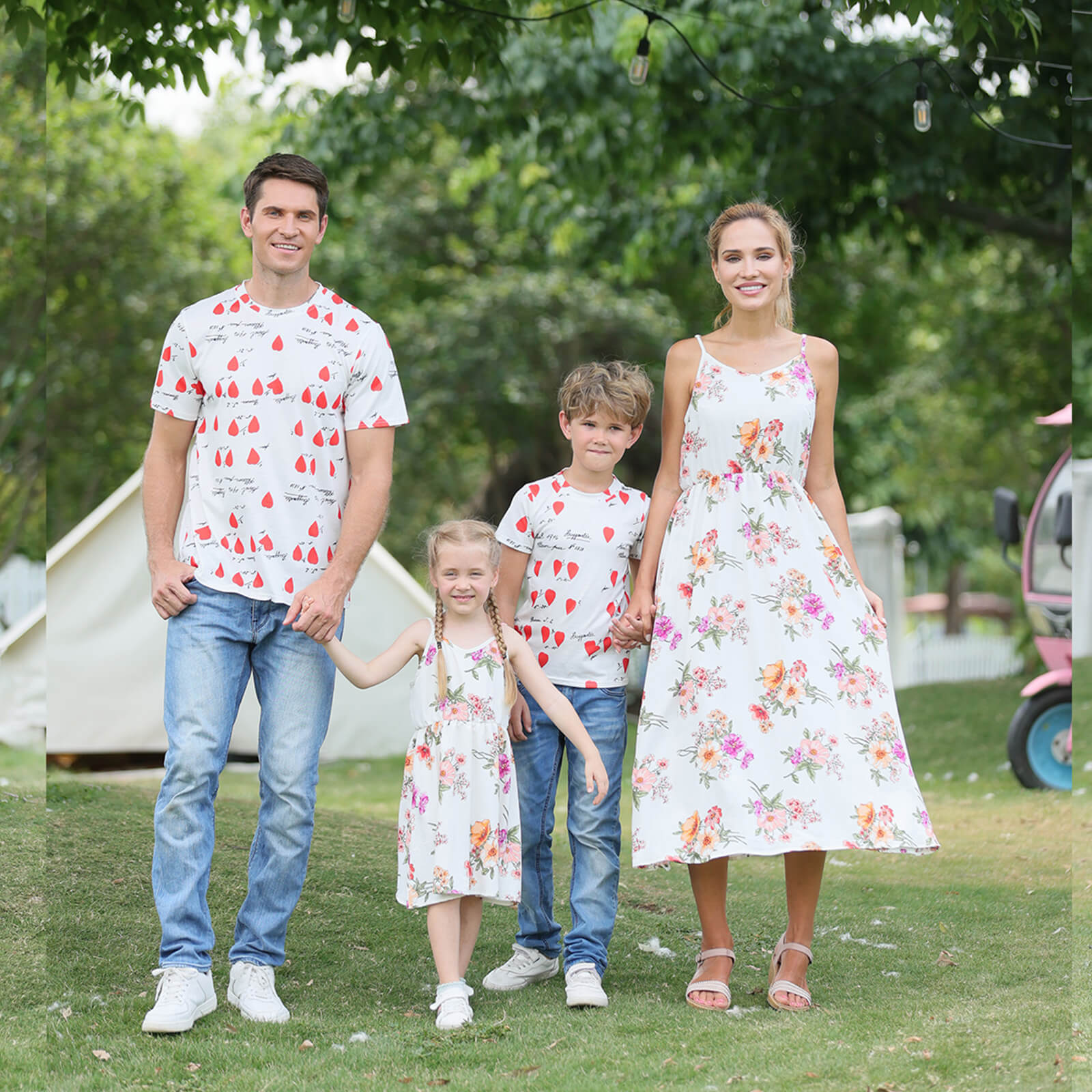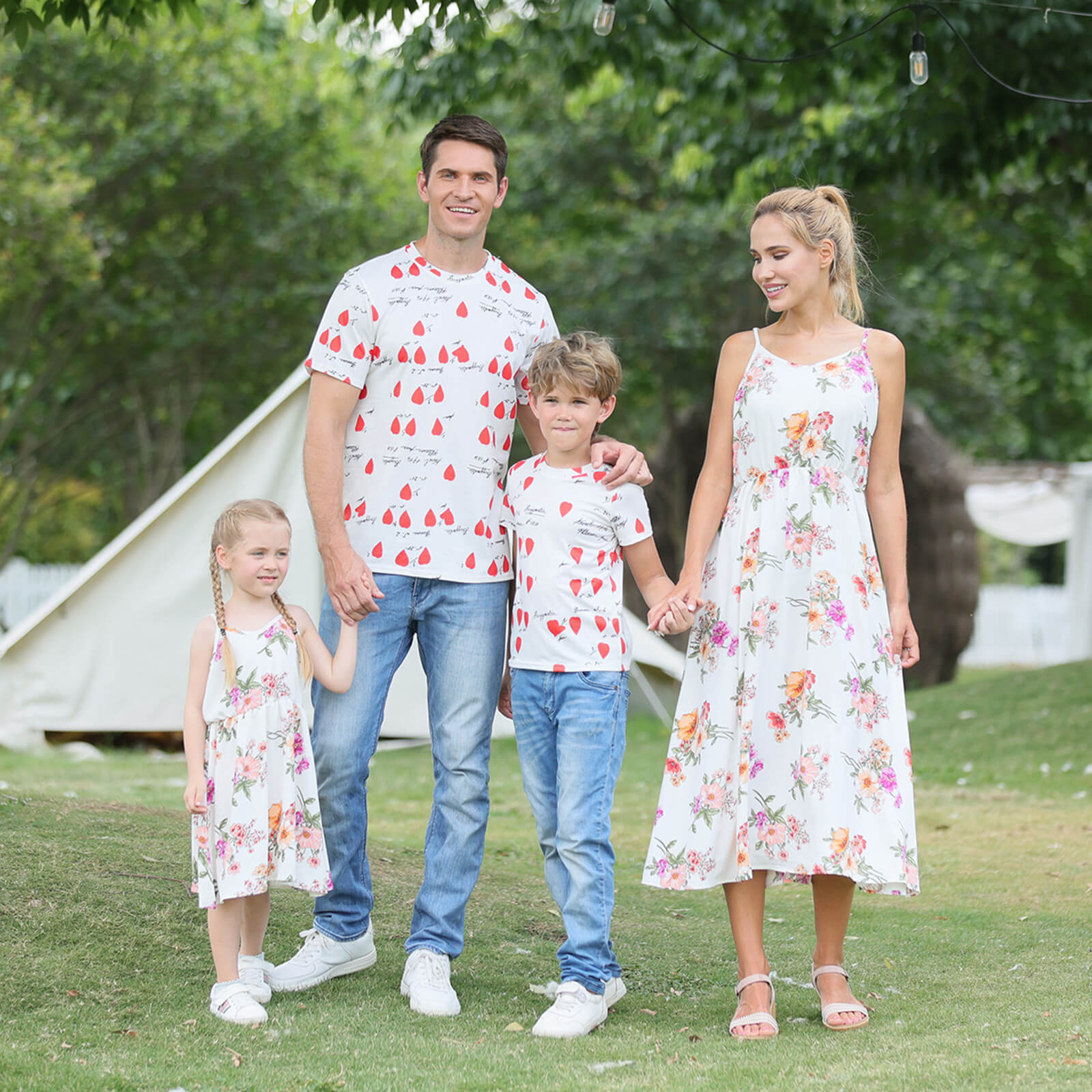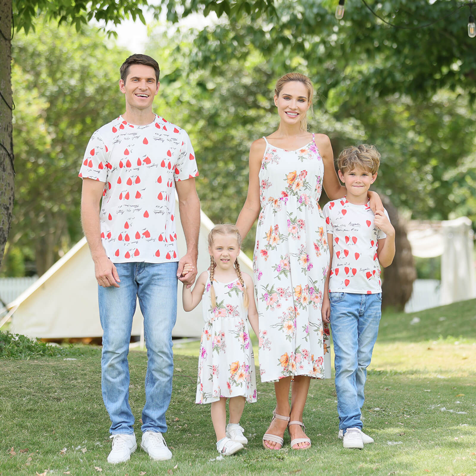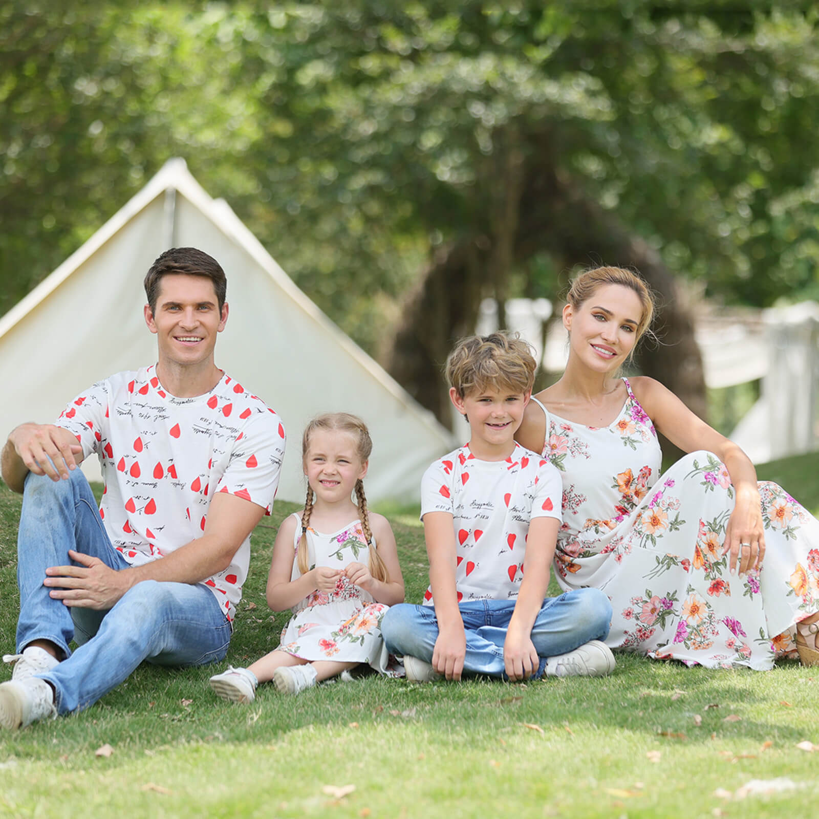 Floral Print Family Matching Tops(Sling Dresses for Mom and Girl-Raglan Sleeves T-shirts for Dad and Boy)TM001