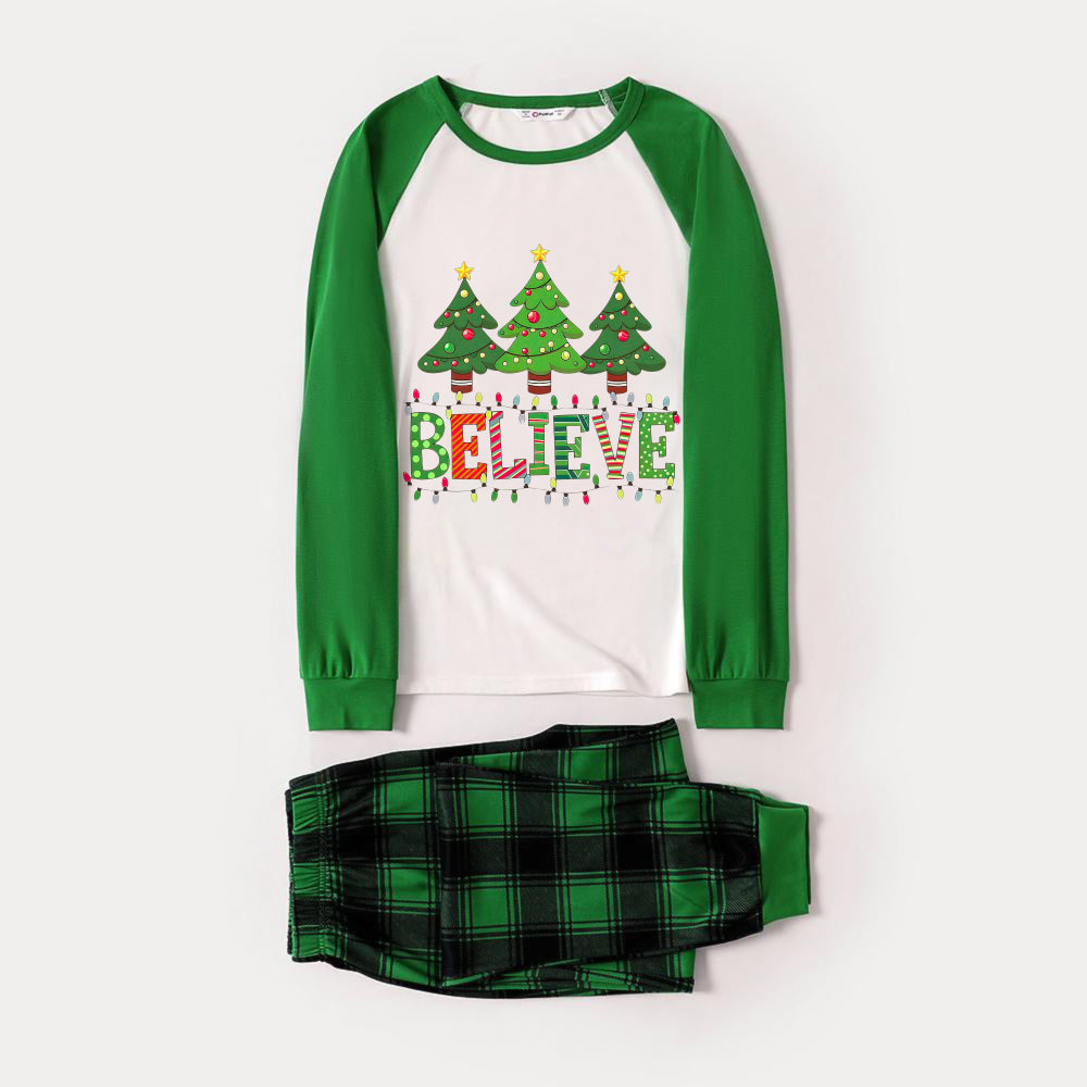Green Raglan Top Green Plaid Christmas Pajamas Set With "BELIEVE" and Christmas Tree Print