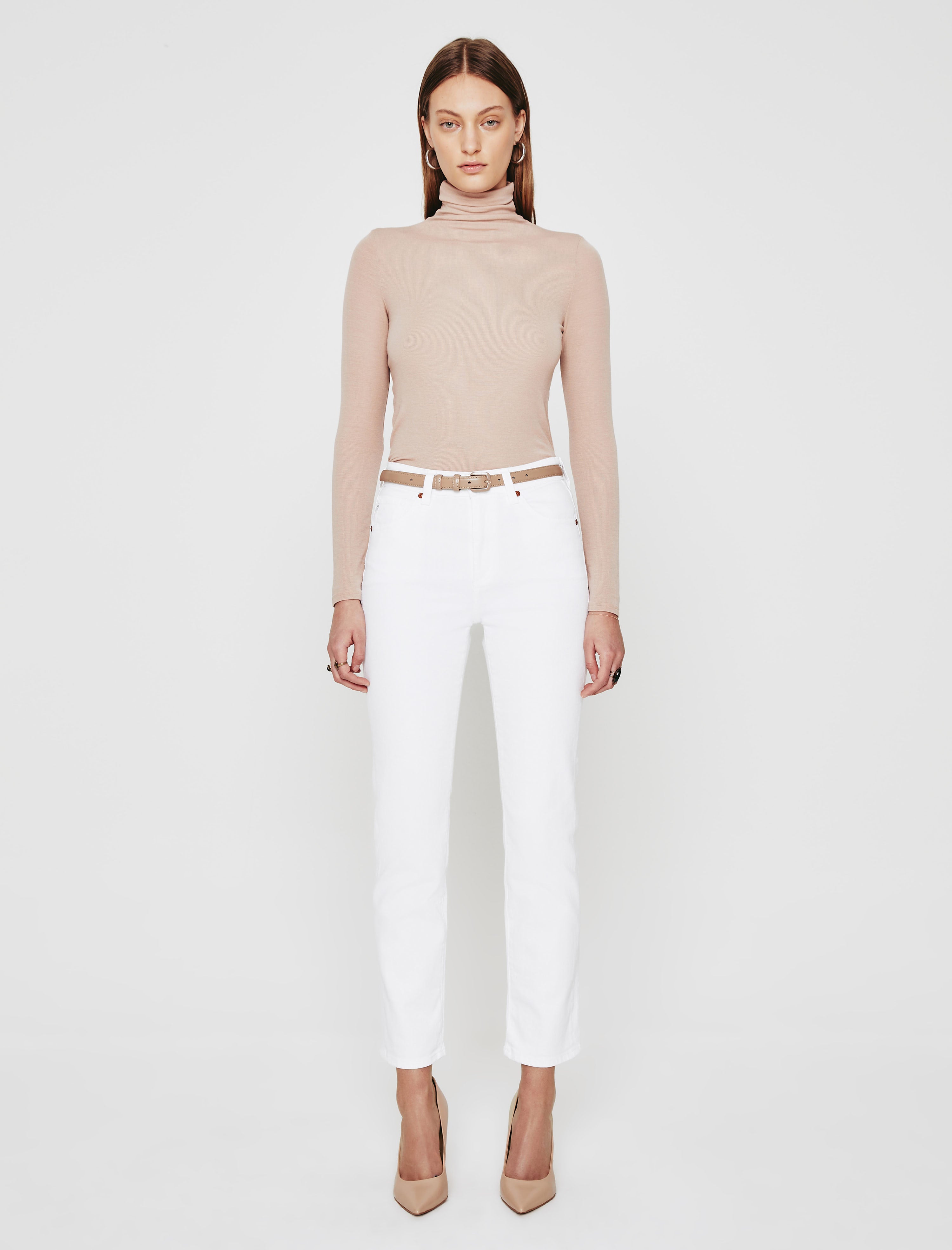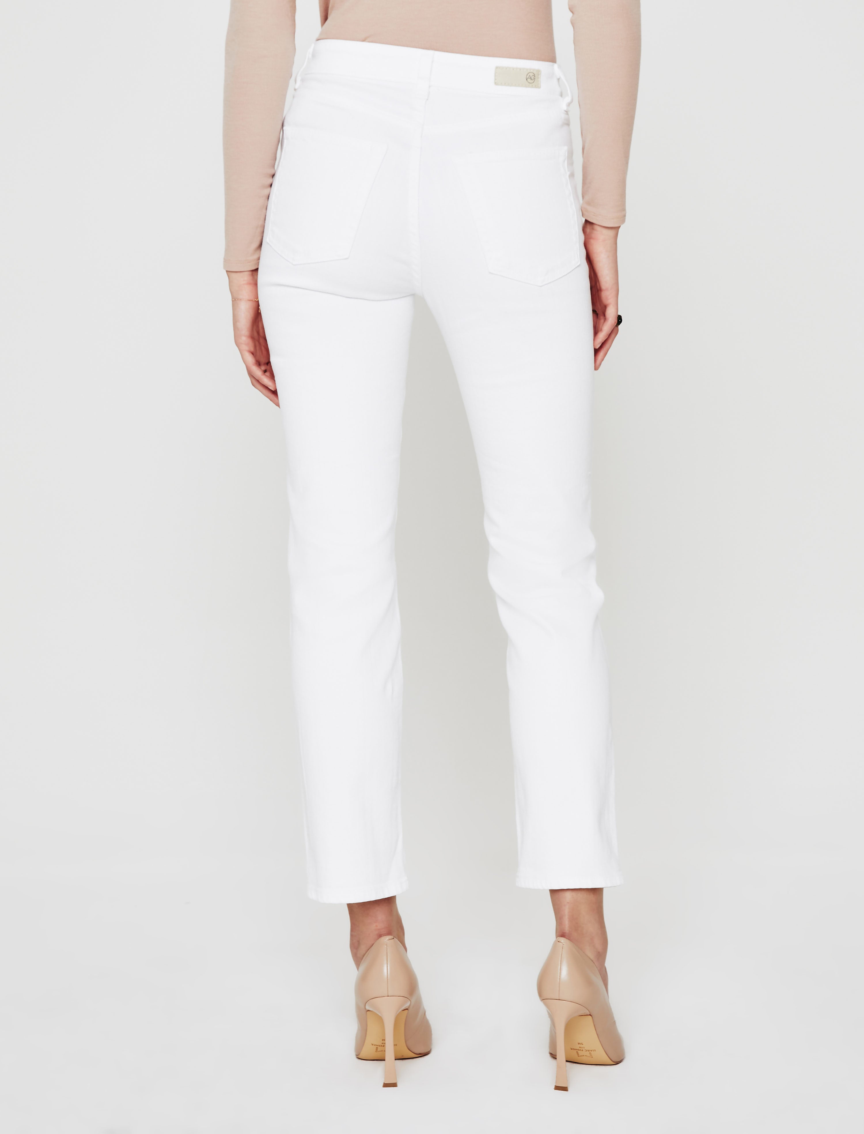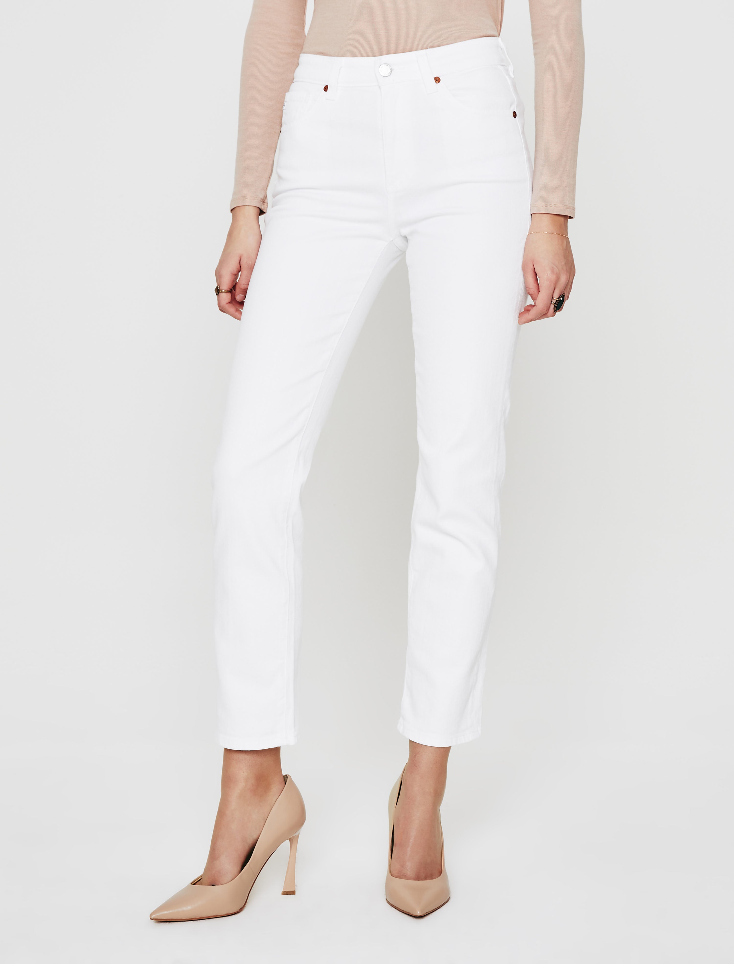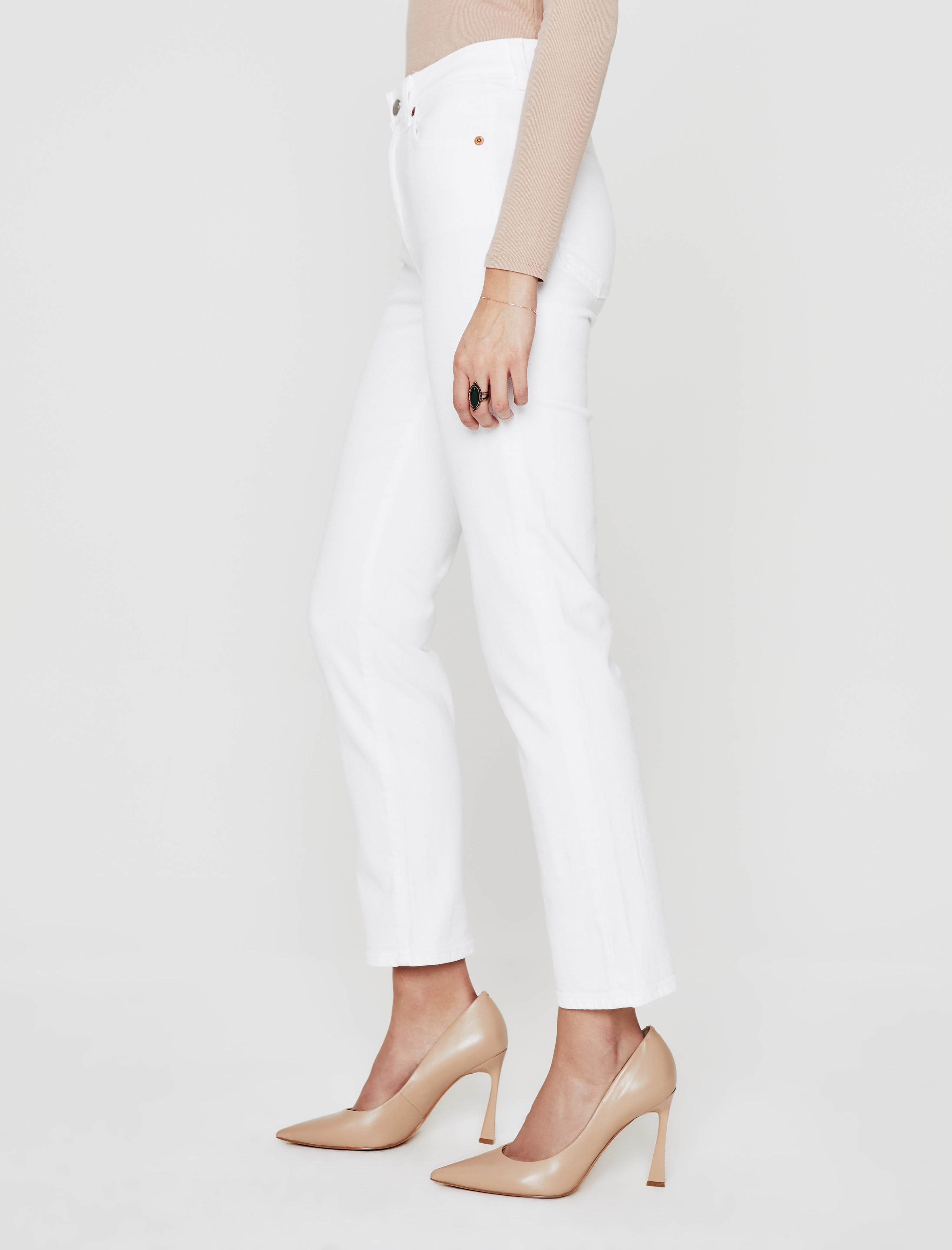 Saige is a women's high-rise straight jean, refreshed for the season in bright, clean white. This high-rise straight is designed in 10 oz. Dover Stretch Denim, a comfortable fabric for everyday wear. Saige is complete with a zip fly, angled yoke, and slightly forward side seams.