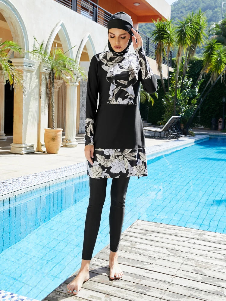 Step into timeless elegance with our Women's Whole Black Burkini Set. This Mujer swimwear ensemble, featuring long sleeves, a matching scarf, and a stylish hair hood, is meticulously designed for the modern Moslem woman seeking both style and coverage. Elevate your swimwear collection with this Muslem Maillot De Bain Femme, ensuring both modesty and contemporary style. Whether by the beach or pool, make a statement with confidence in this sophisticated Burkini, offering the perfect blend of grace and coverage. Embrace the essence of modest fashion with a touch of timeless charm in this chic and comfortable swimwear ensemble.