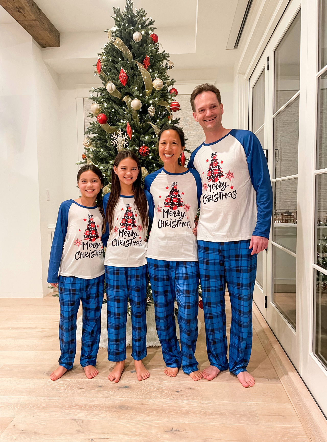 "Family Christmas 2025" Letter Printed Blue Long Sleeve Top With Blue Plaid Family Matching Pajamas