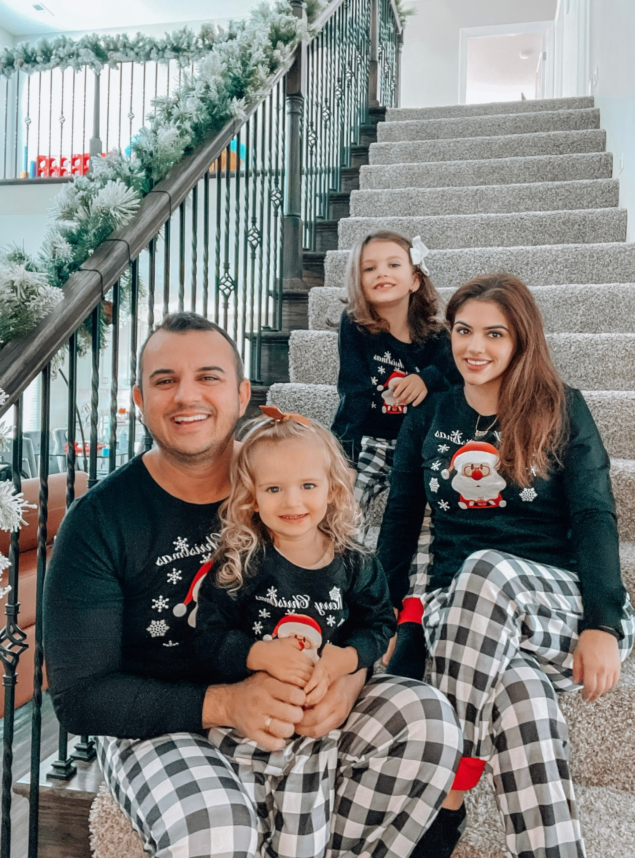 "Santa Squad" and Santa Claus Print Black Long Sleeve Top with Black And White Plaid Pants Family Matching Pajamas