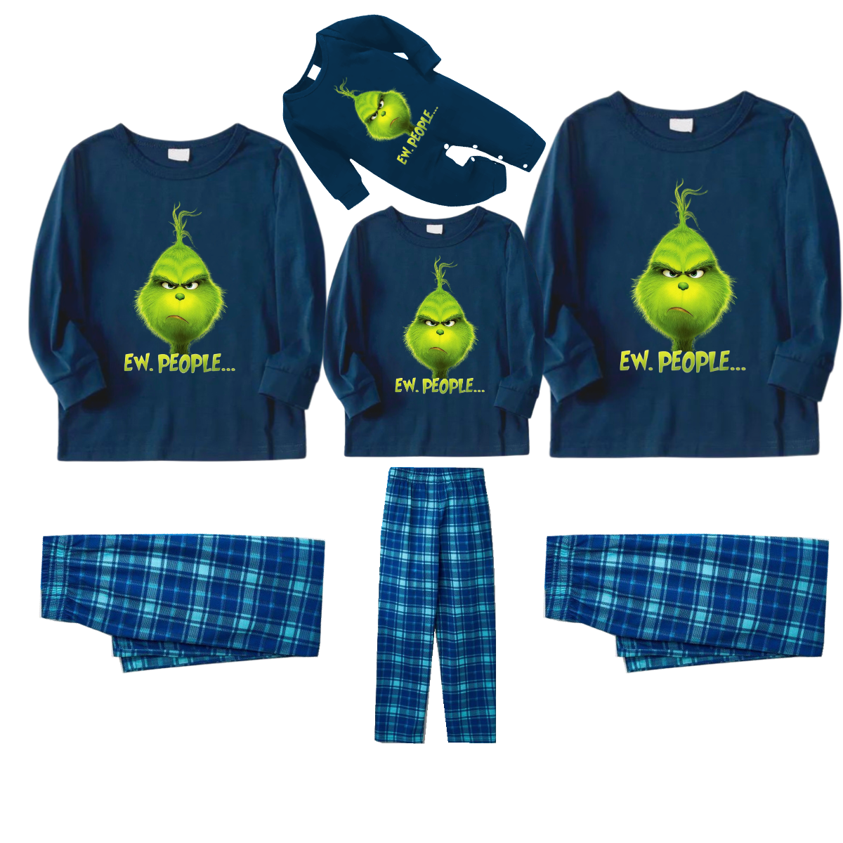 Christmas Cartoon Pattern and EW People Print Blue Long Sleeves with Blue&White&Black Plaid Pants Family Matching Pajamas