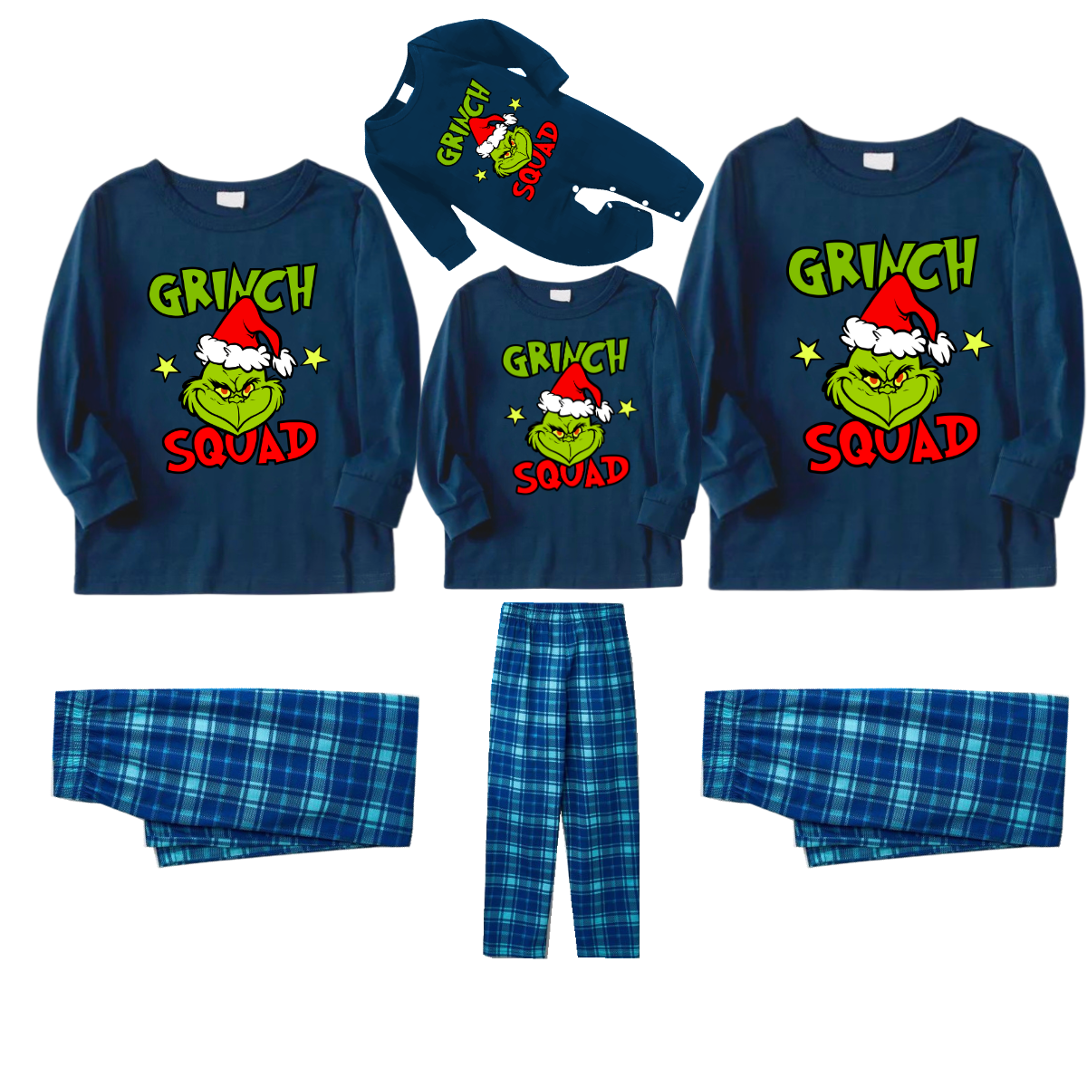 Christmas Cute Cartoon Face and Letter Print Blue Long Sleeve Top with Red & Blue Plaid Family Matching Pajamas
