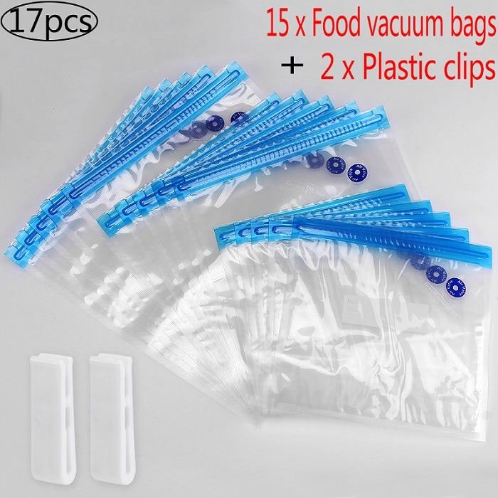 15 x Food vacuum bags(5 small;5 mid;5 big) 2 x Plastic clips