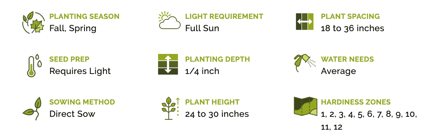 The seeds can be planted in August or September and established plants grow in full sun and well-drained soil, tolerating a wide range of soil conditions and some light shade.