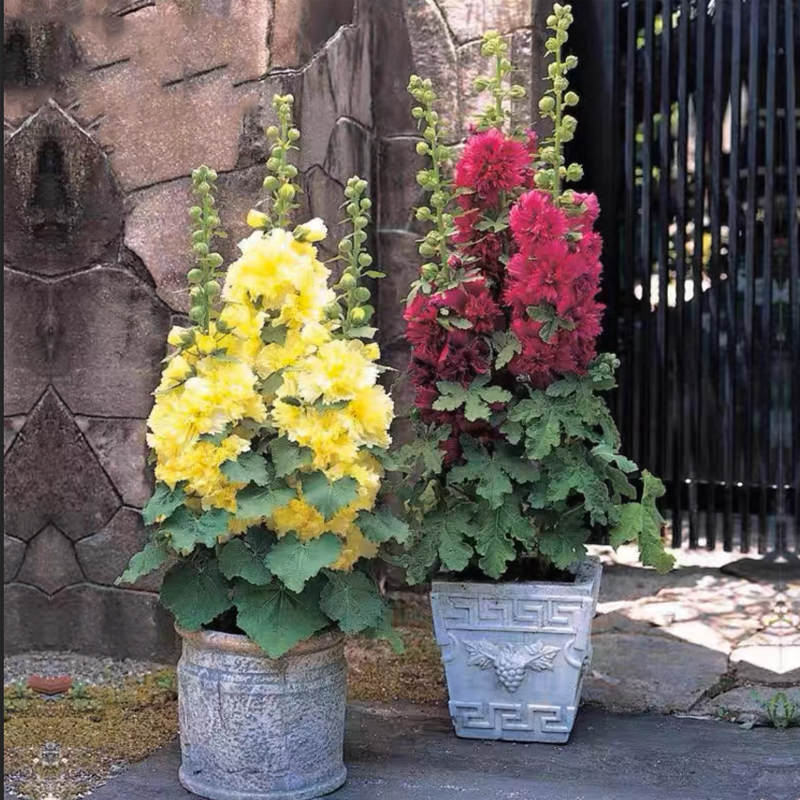 Hollyhock is a hardy biennial flowering plant that produces fully-double scarlet, pink, white, purple, brown and yellow flowers on sturdy spikes.