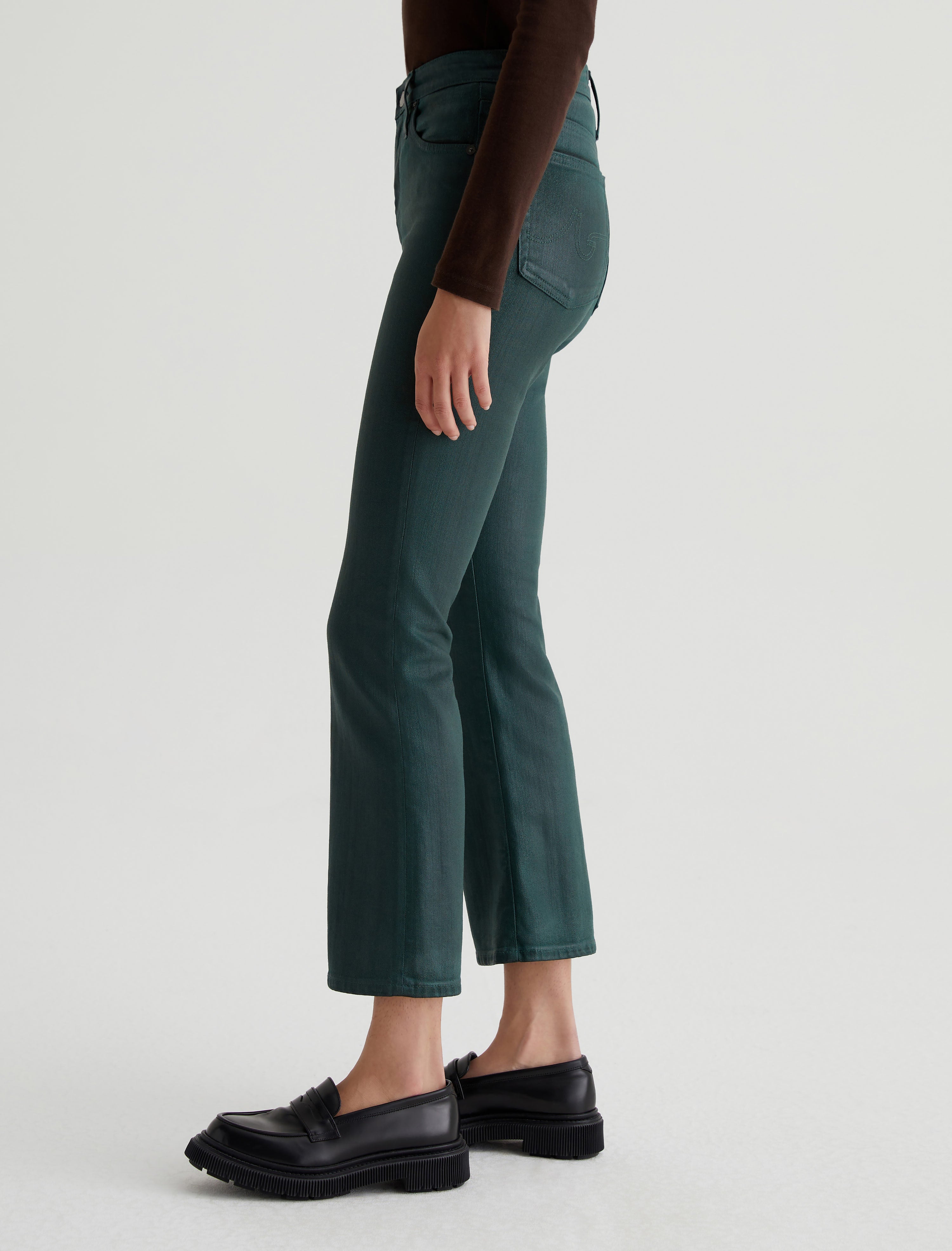 The Farrah Boot Crop is a high-rise bootcut jean in a cropped length, updated here with a leatherette finish. The pair sits high on the waist and has a skinny fit through the leg before opening into a subtly flared shape. These coated bootcut jeans are crafted from 10 oz. Dover Stretch Denim for a sleek, comfortable silhouette.