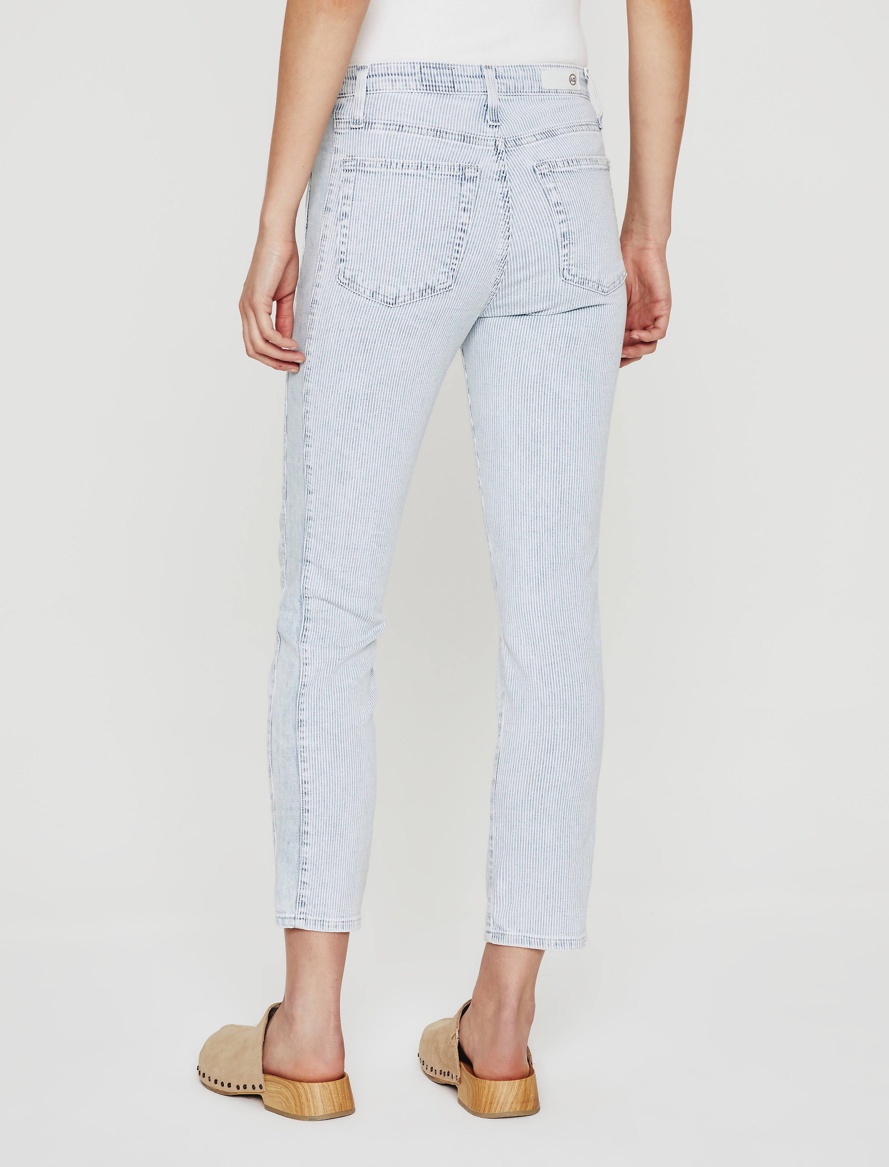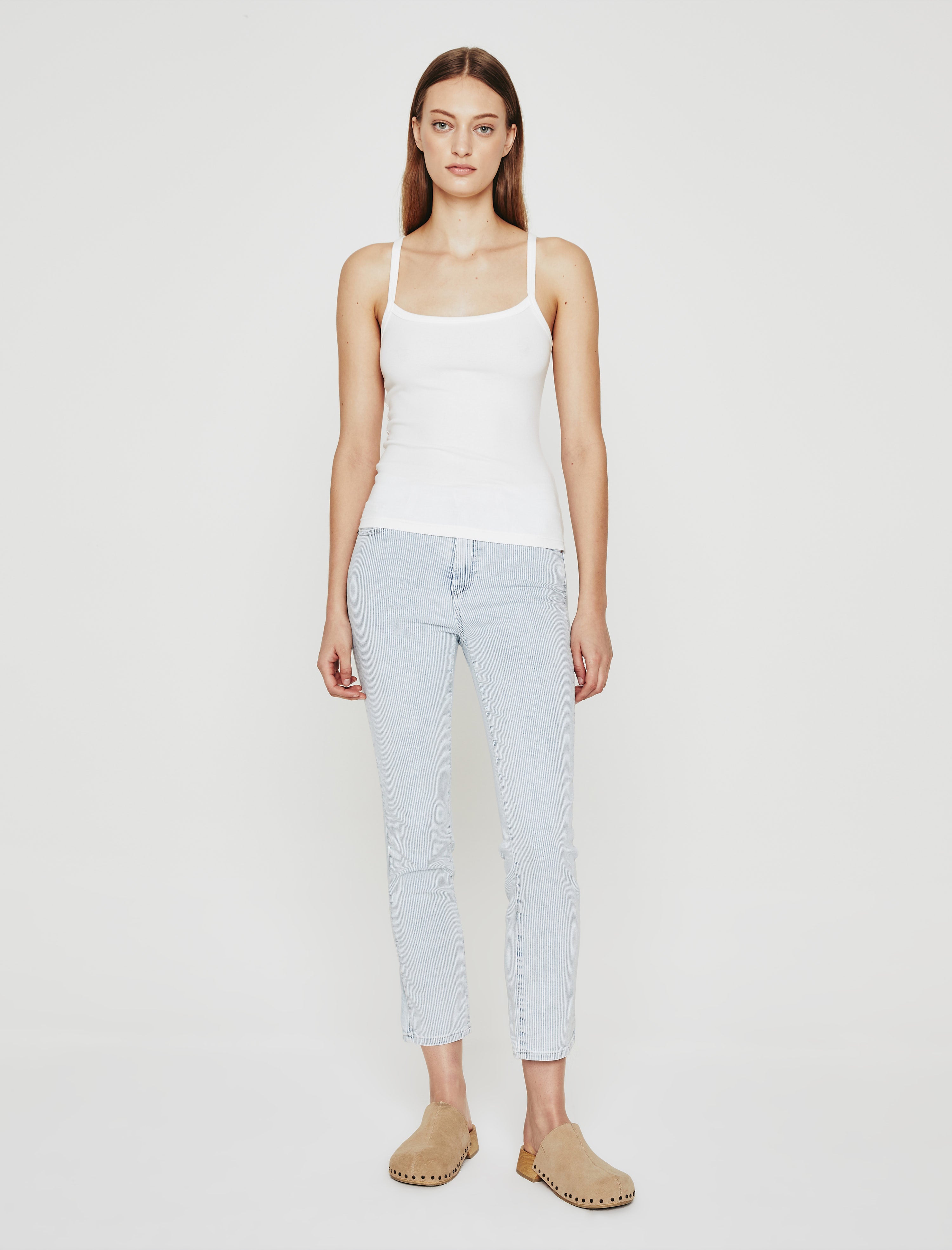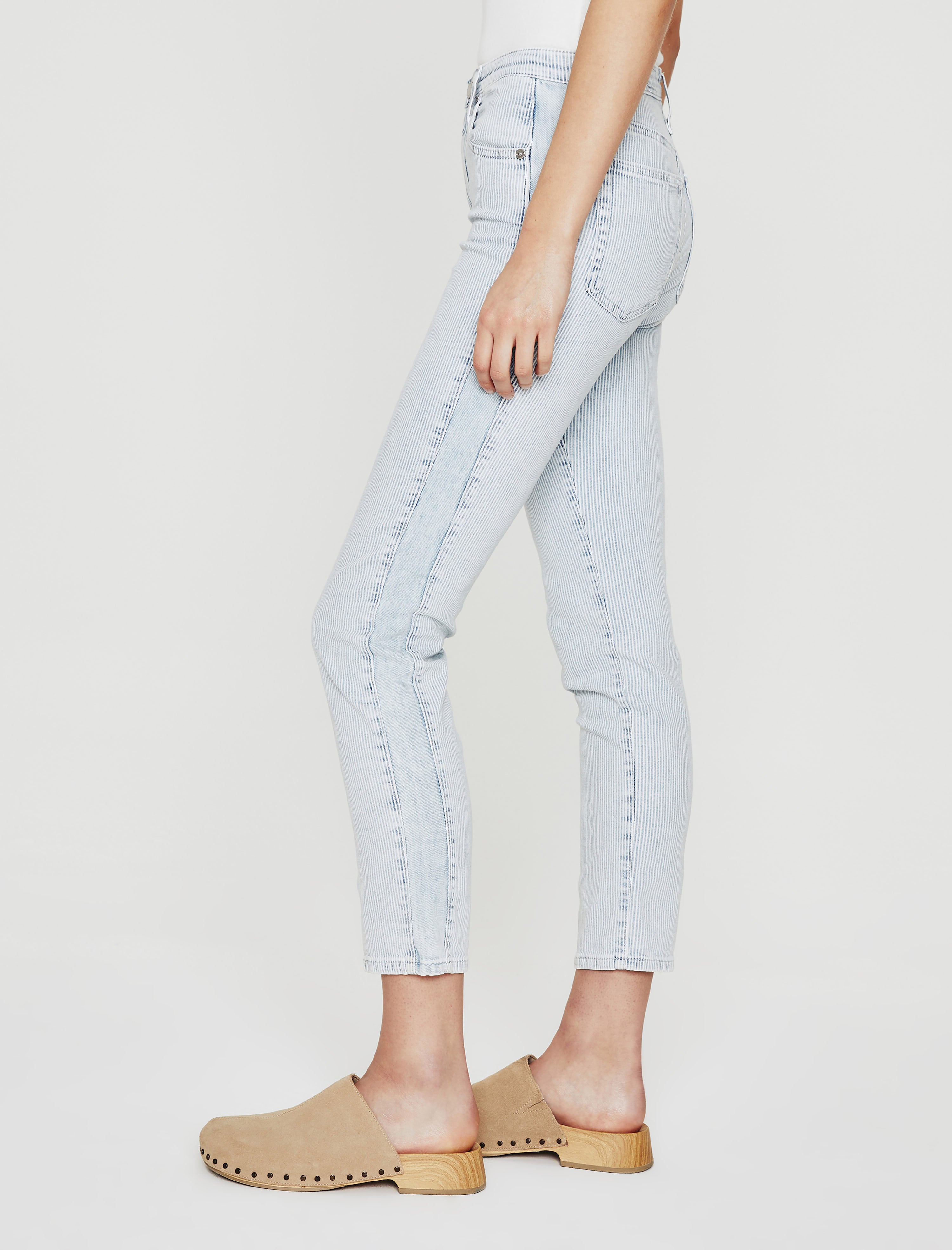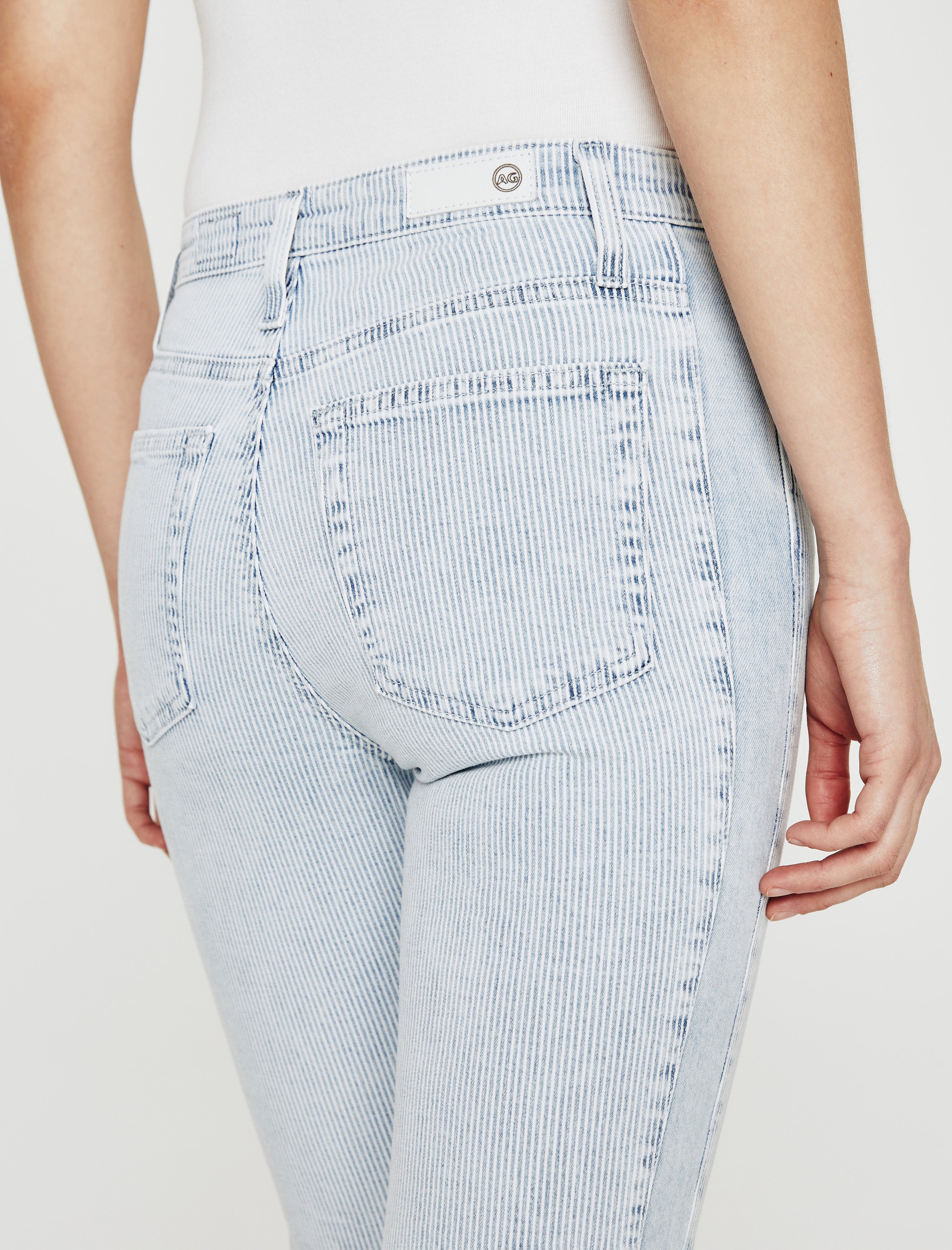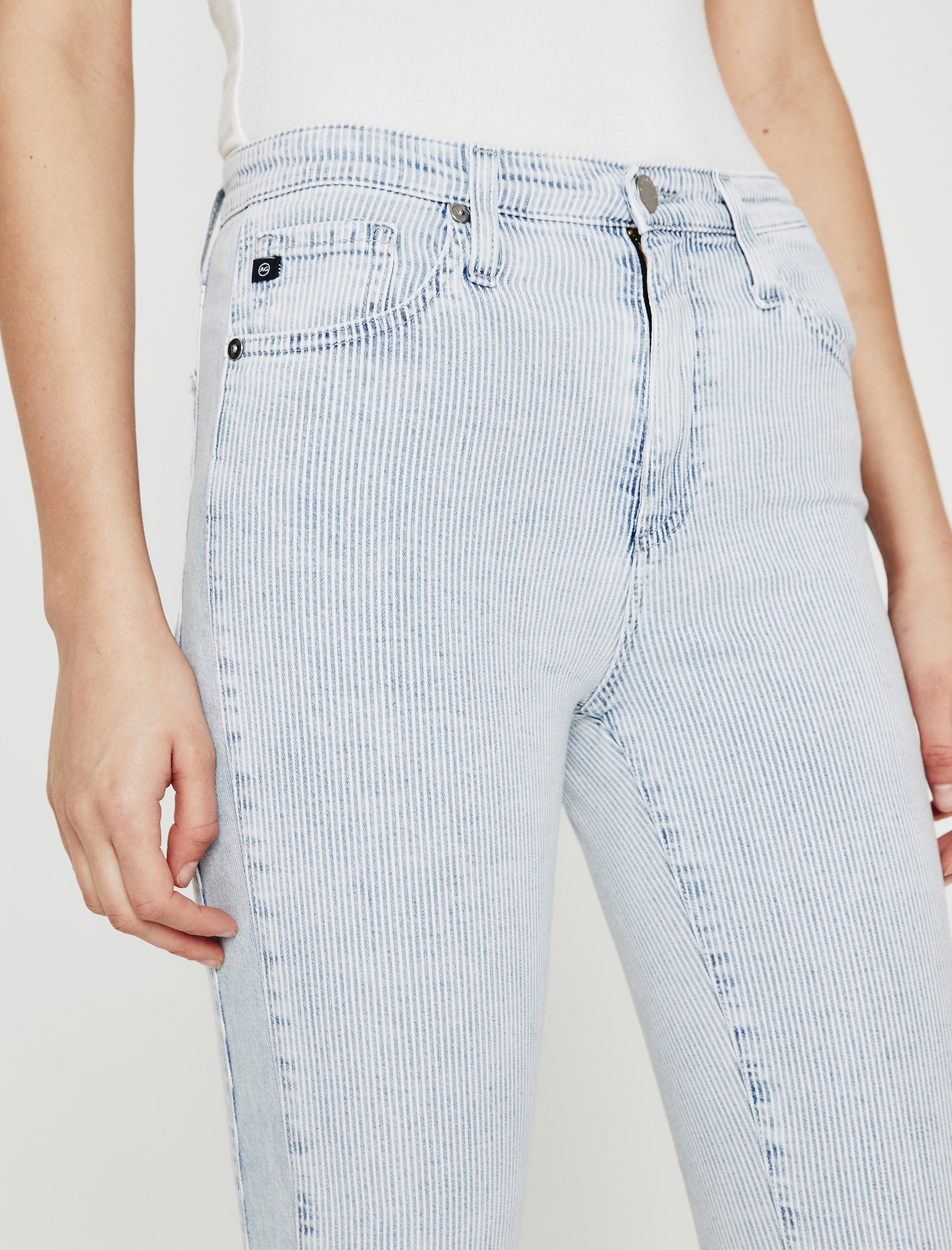 Our Isabelle Side Panel jean is a high-rise straight crop in light blue and white hickory stripes for a summery workwear vibe. It's crafted from 9 oz. cotton-blend Carlisle Stripe denim that's faded and soft to the touch. A hint of stretch keeps the pair comfortable and easy to wear.