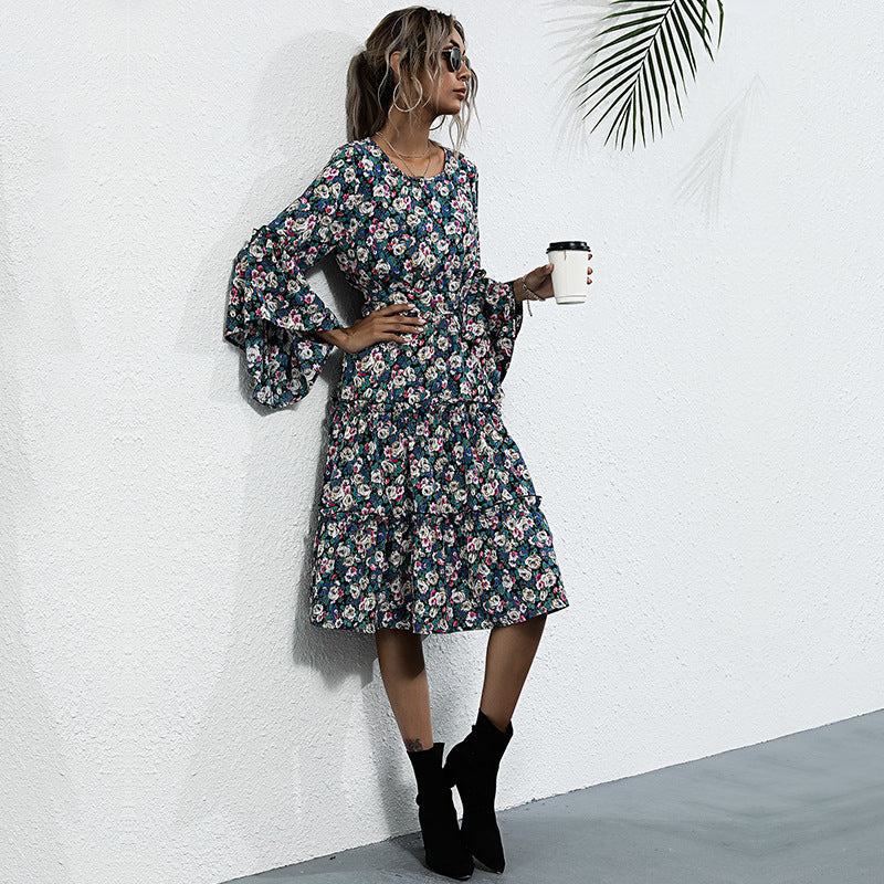 Nine-quarter Sleeve Spring And Autumn Floral Print Dress Ladies Party Belt Ruffled Round Neck A-line Elegant Summer Dress