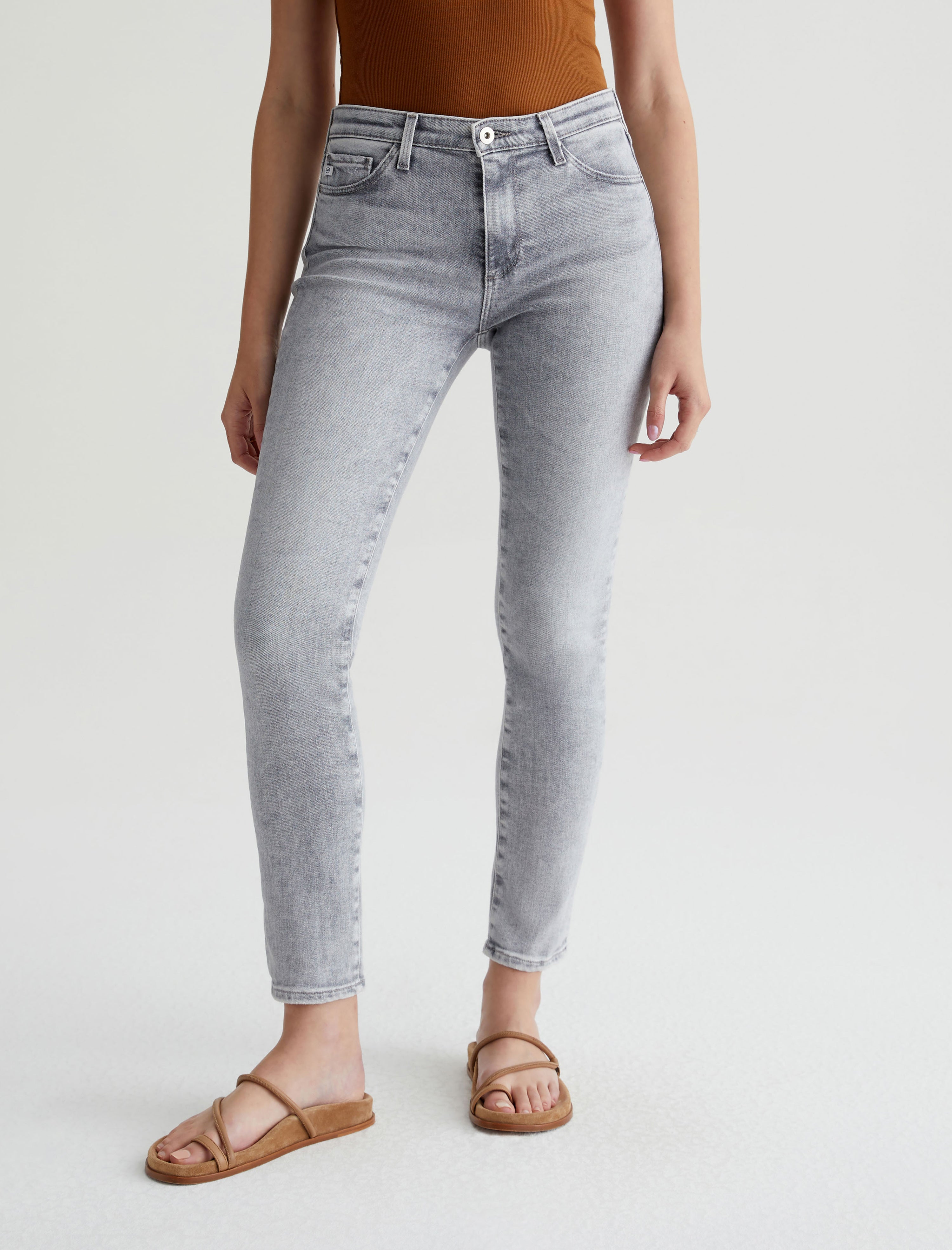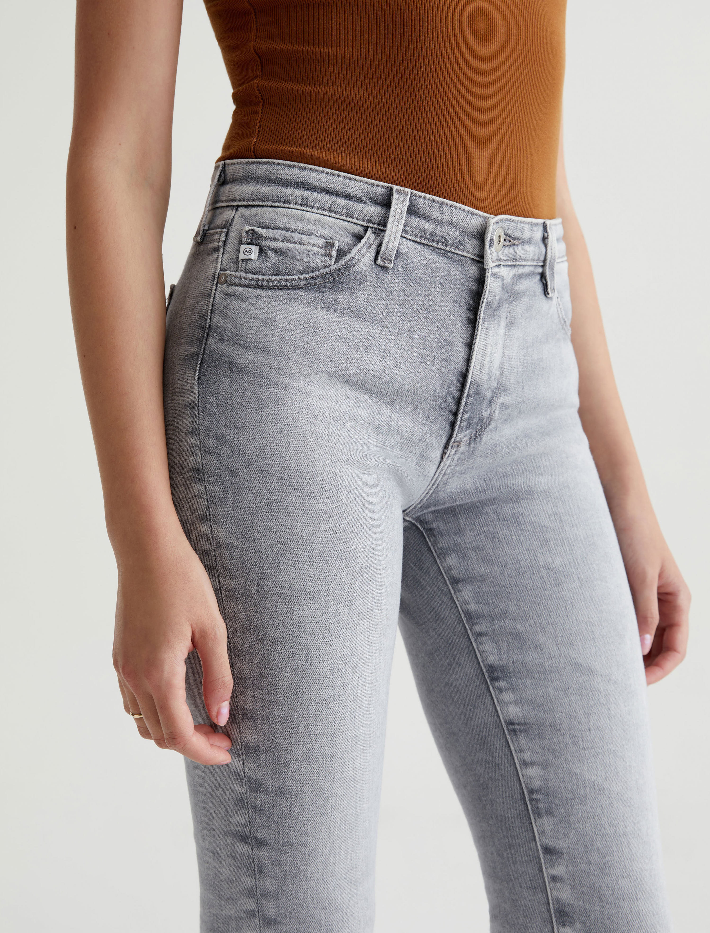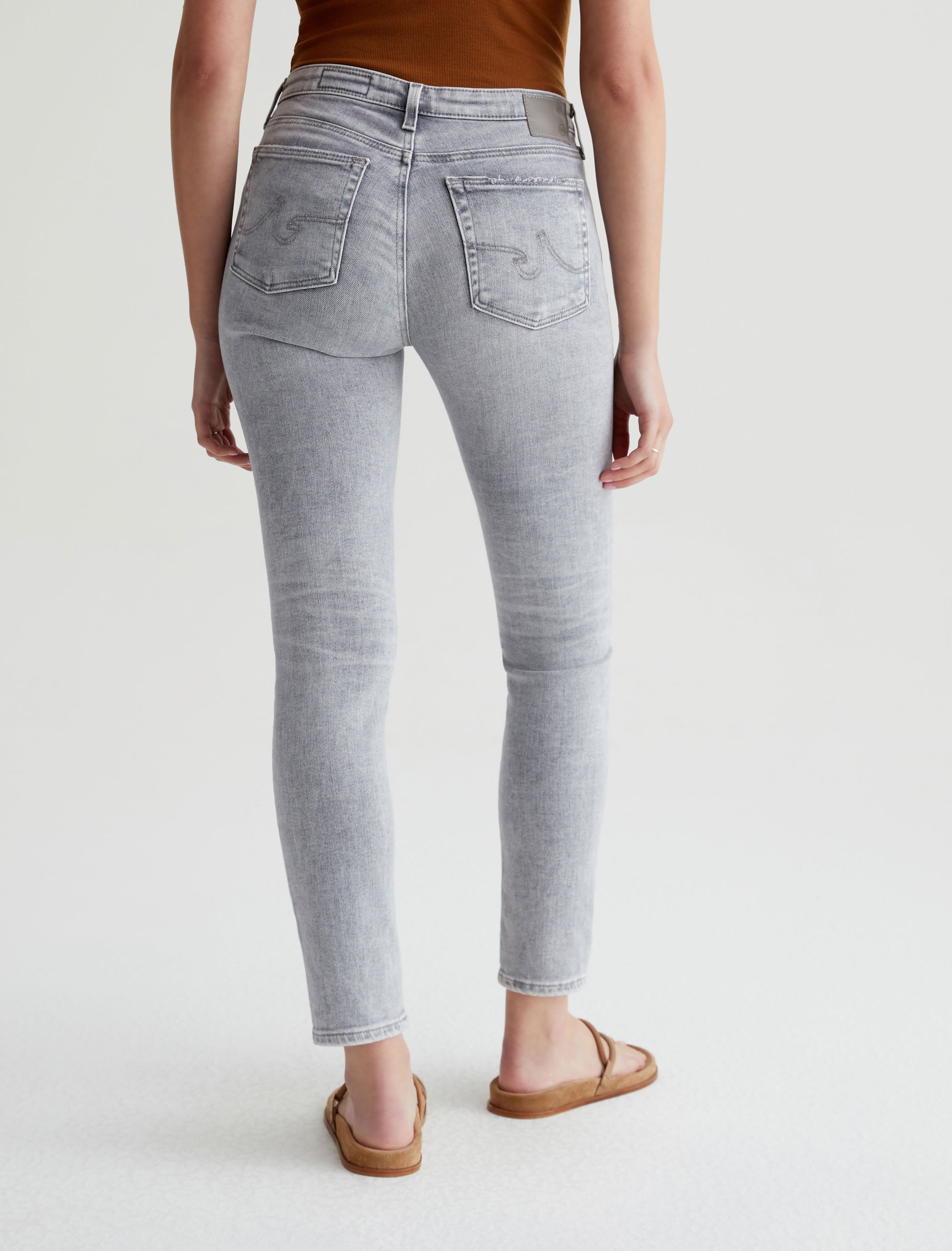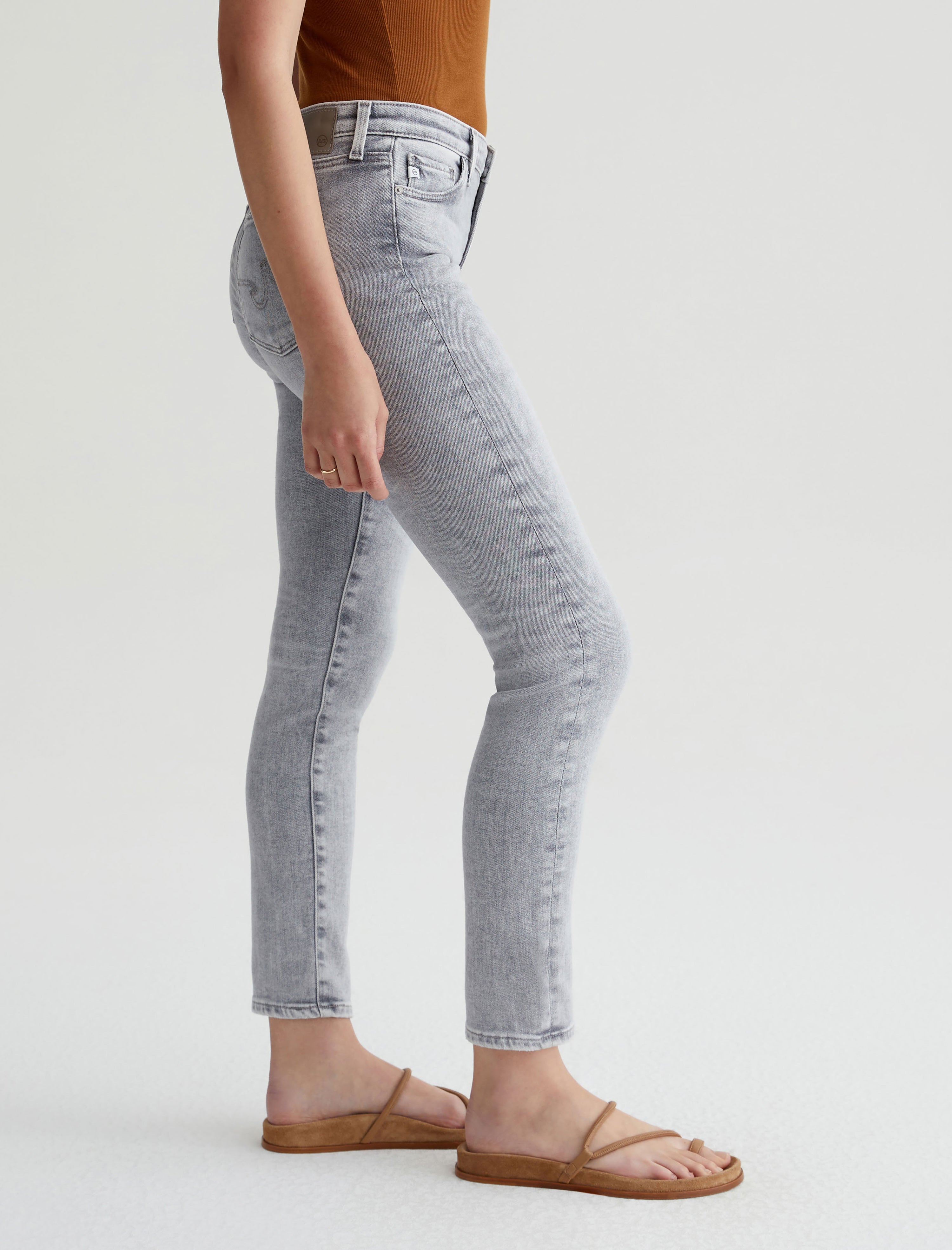 The Prima Ankle is a mid-rise cigarette jean in a light grey shade with a subtle acid-wash character. There's a bit of darker grey left over at the seams and edges. The pair has a fitted silhouette through the hips and slight tapering at the legs before cropping at the ankle. This women’s cigarette jean is designed in comfortable 11.75 oz. Carbone Stretch Denim.