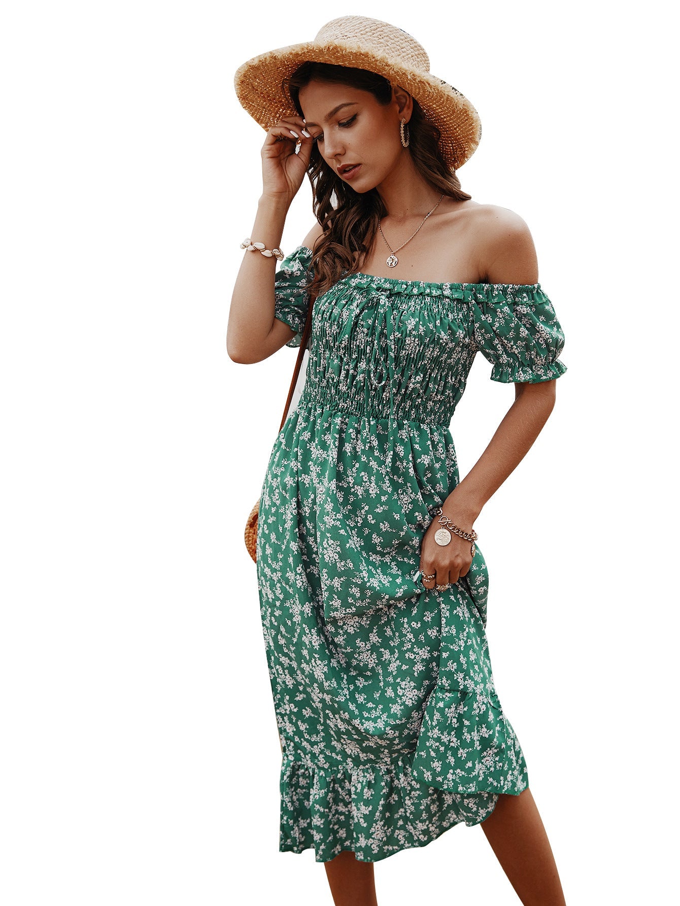 Boho Off-the-shoulder Dress Women's Cotton Twill Neck Floral Short Sleeve Elegant Dress