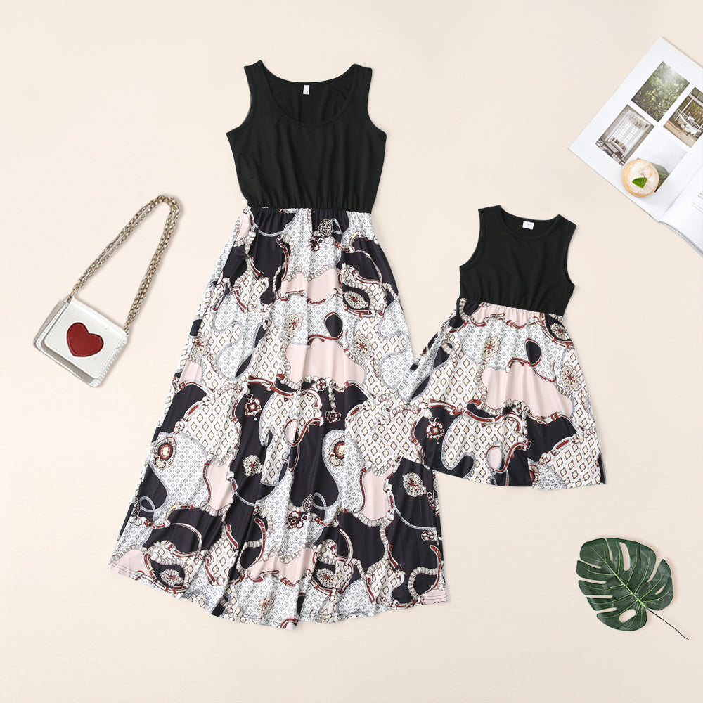 Fashionable Printed Sleeveless Mommy and Me Maxi Dress-Black