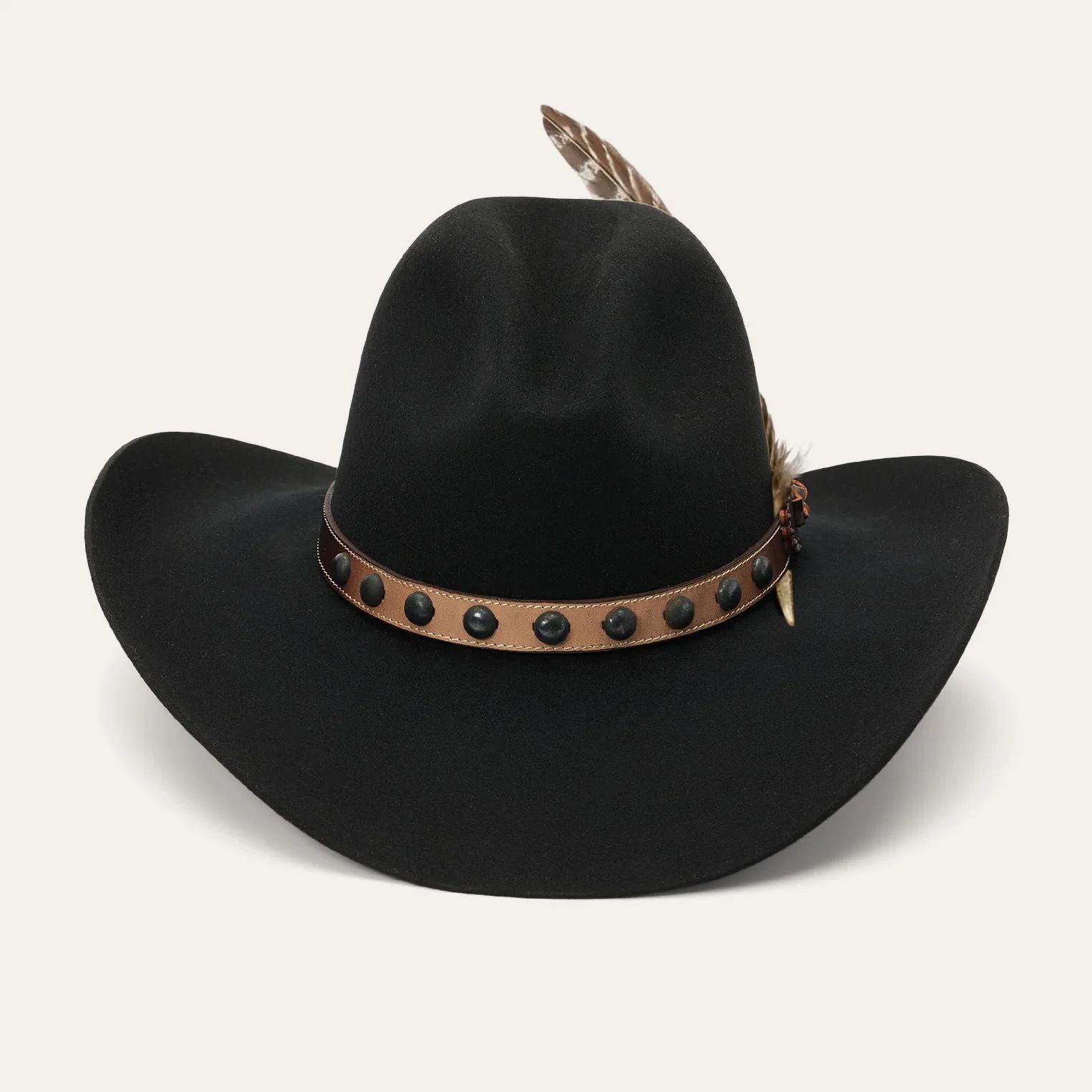 Handmade durable, weather-resistant quality felt, the Broken Bow 4X features an iconic 4" x 5" sloped Gus crown with a cattleman crease and a 4 3/8" brim. Its rugged style is augmented by a leather hat band with antique brass-tone studs and side tie and a removable turkey feather detail.