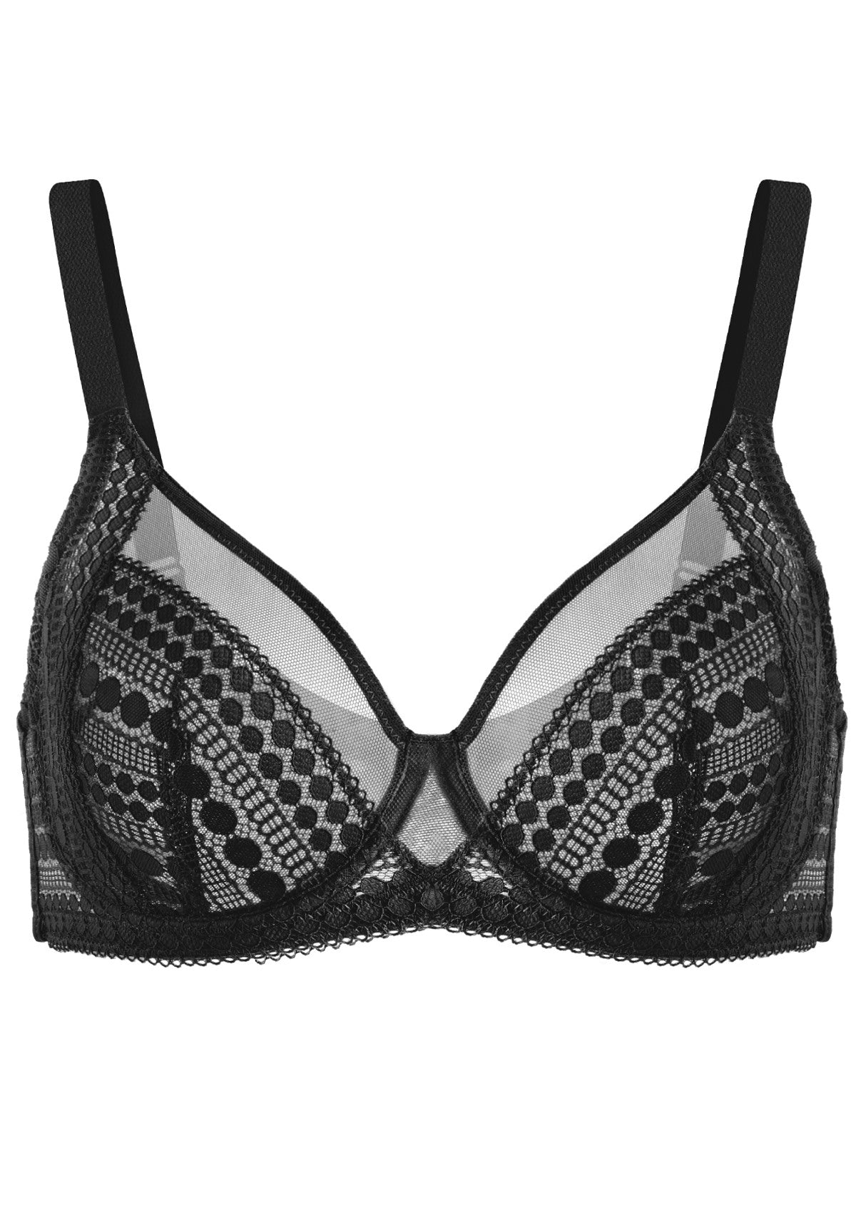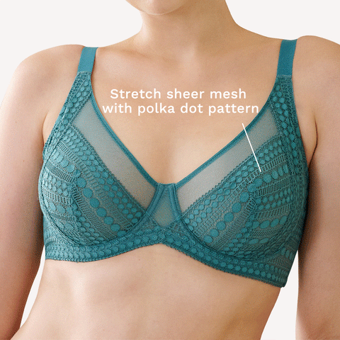 This unlined underwire bra is a wearable work of art, featuring sheer mesh along the cup tops and a polka dot patterned along the bottom and sides of the cups.