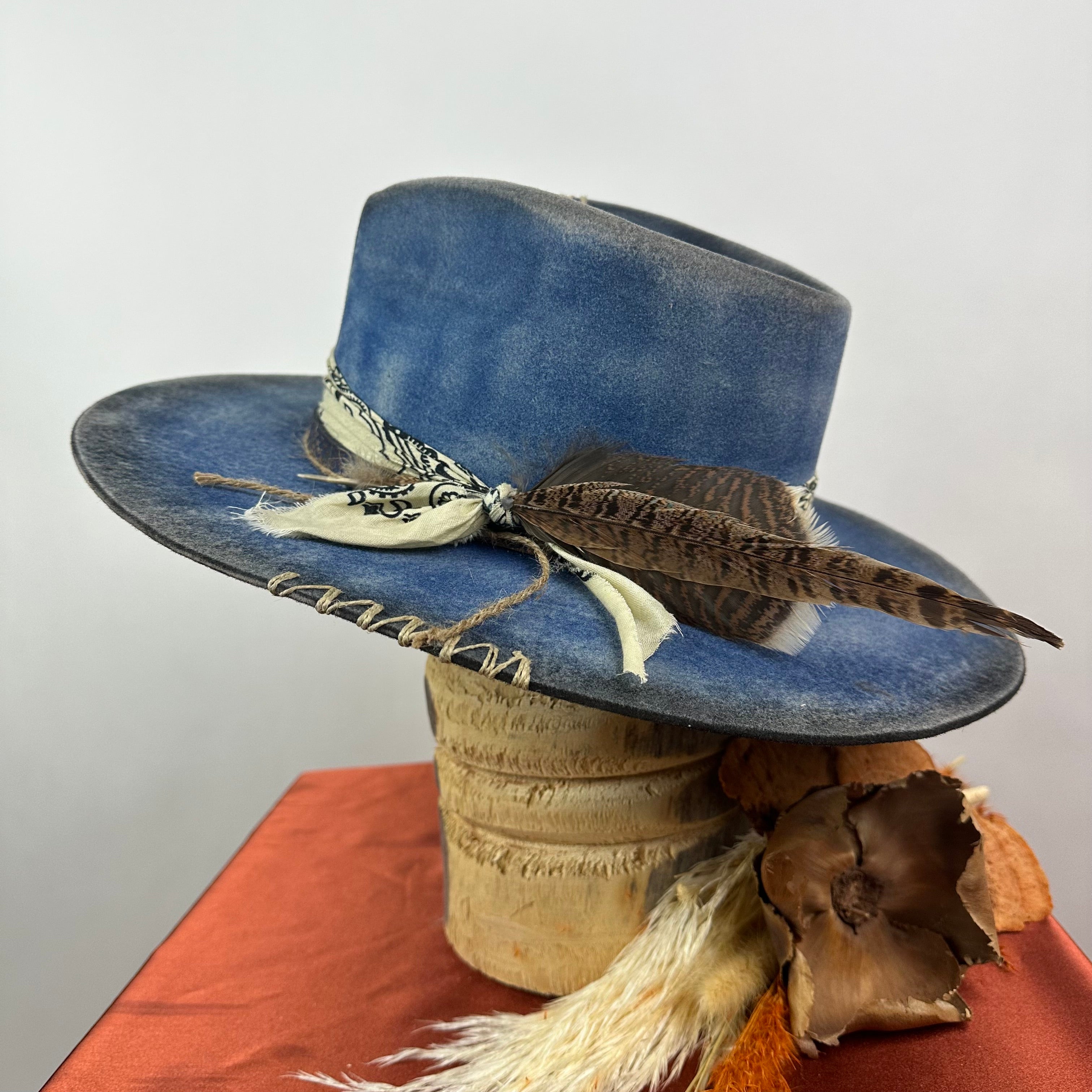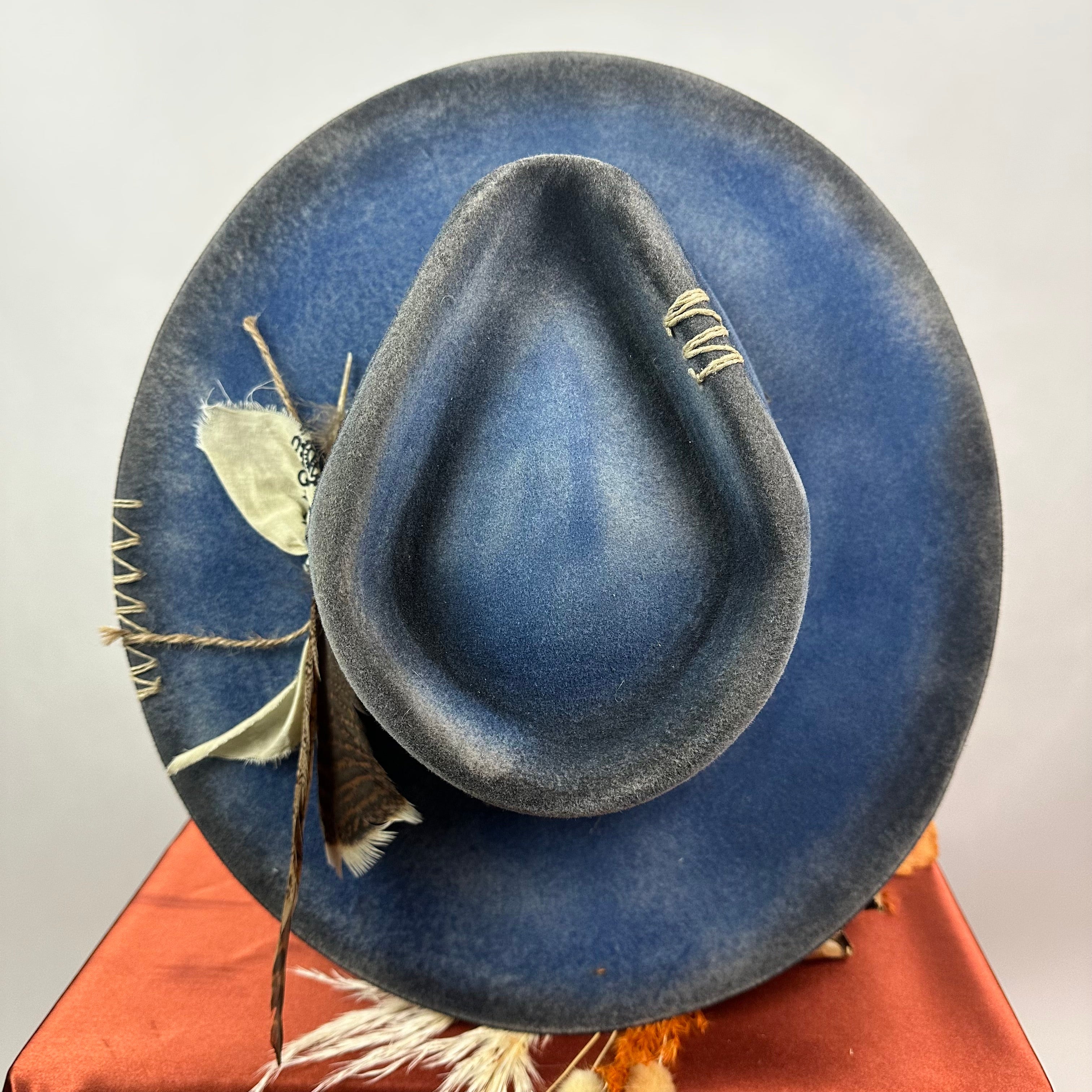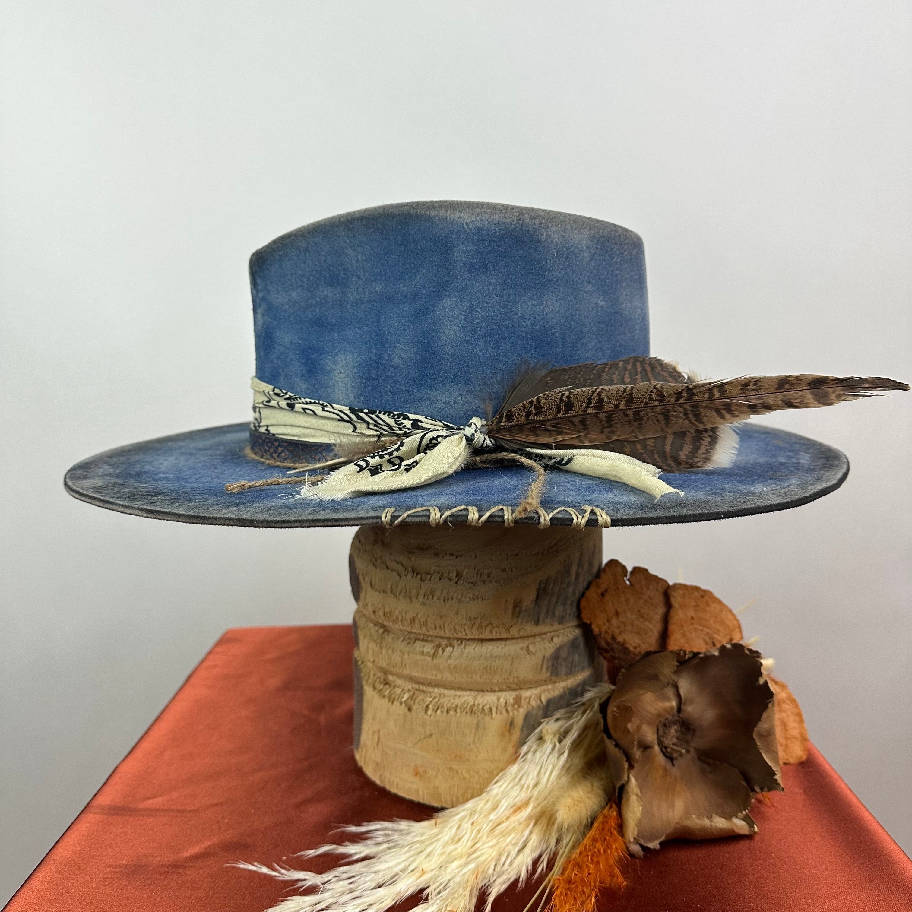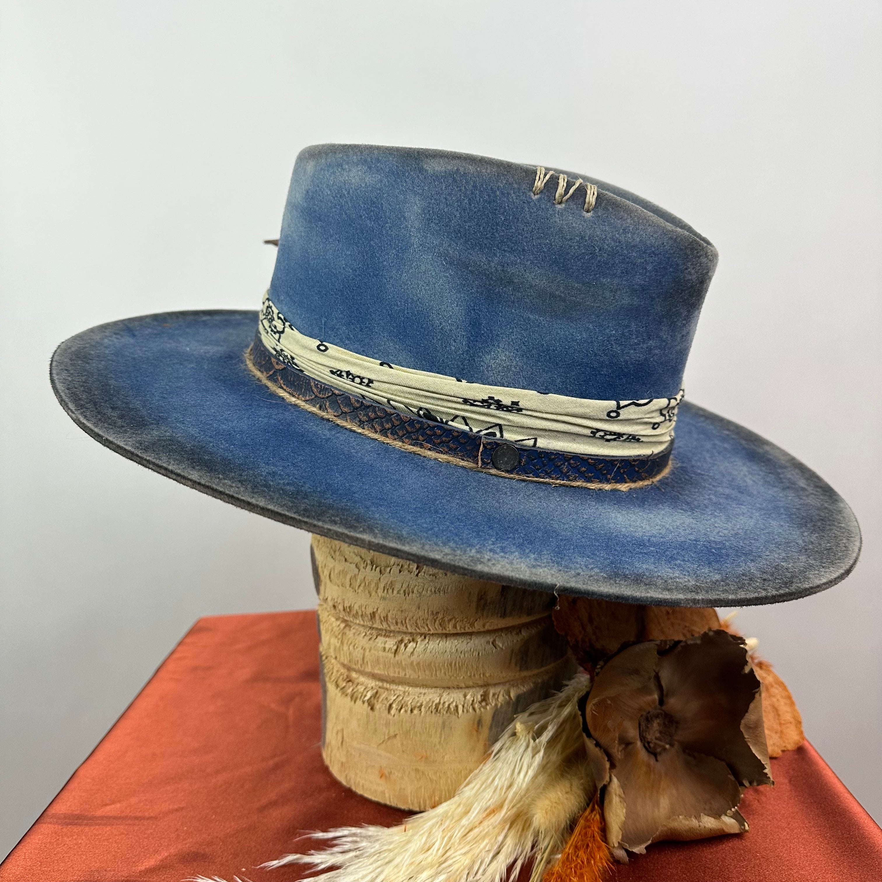 "Distressed Fedora Traveler Tale Blue" is handcrafted, hand-dyed and hand-distressed. That means no two hats have the same color or character, making each hat truly one of a kind. Unique to each hat.