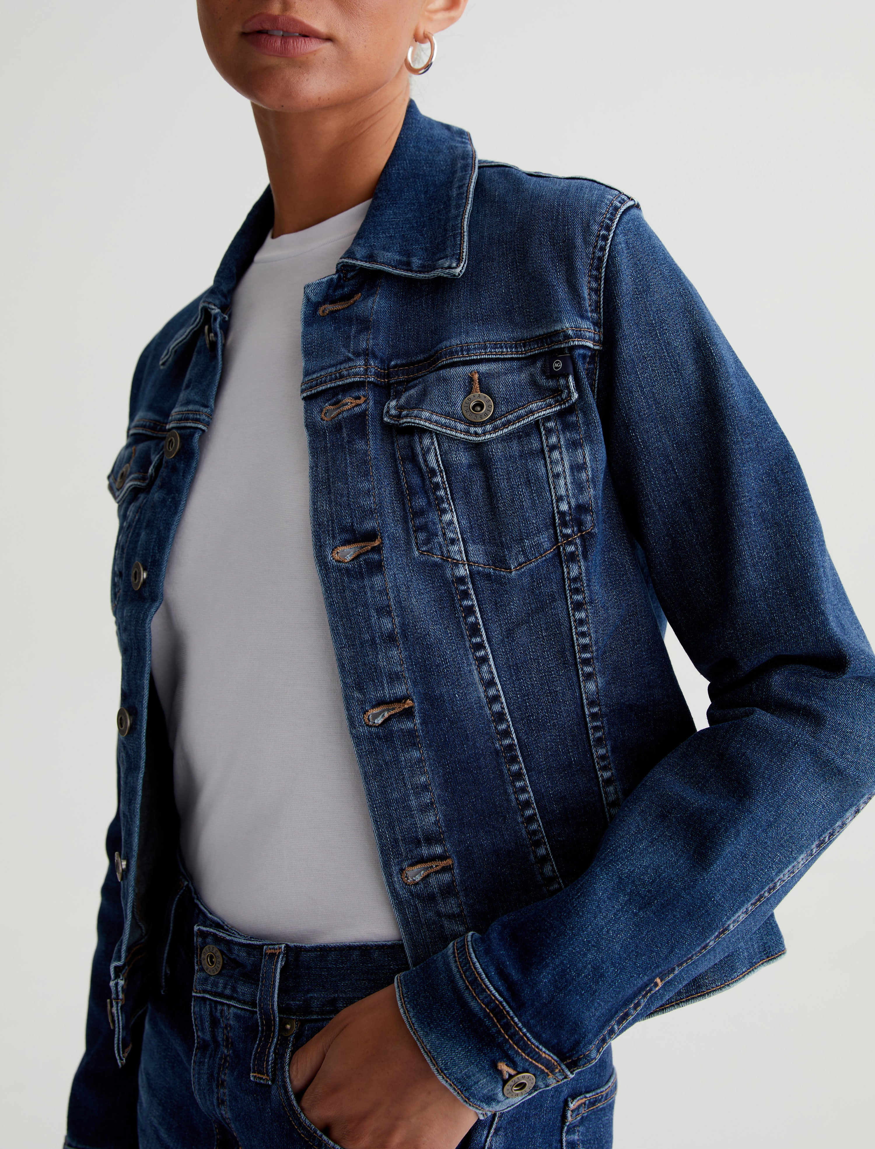 The Robyn Jacket is a slim jean jacket for women featuring a true vintage dark wash with placement shadows, fitted silhouette throughout, and classic chest pockets with tonal button closures. This women’s jacket is designed in a body-hugging 10 oz. Rouge Advanced Stretch Denim—a lightweight, super stretch fabric that lends itself beautifully to light and dark indigo shades.