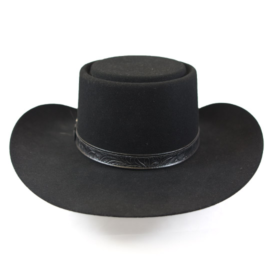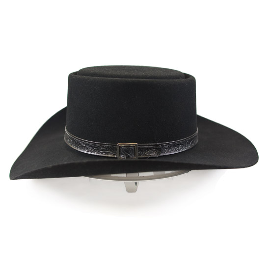 The Revenger 5X Cowboy Hat is constructed of 5X quality wool felt and features a gambler crown and tooled leather hat band. 5X Quality Wool Felt.