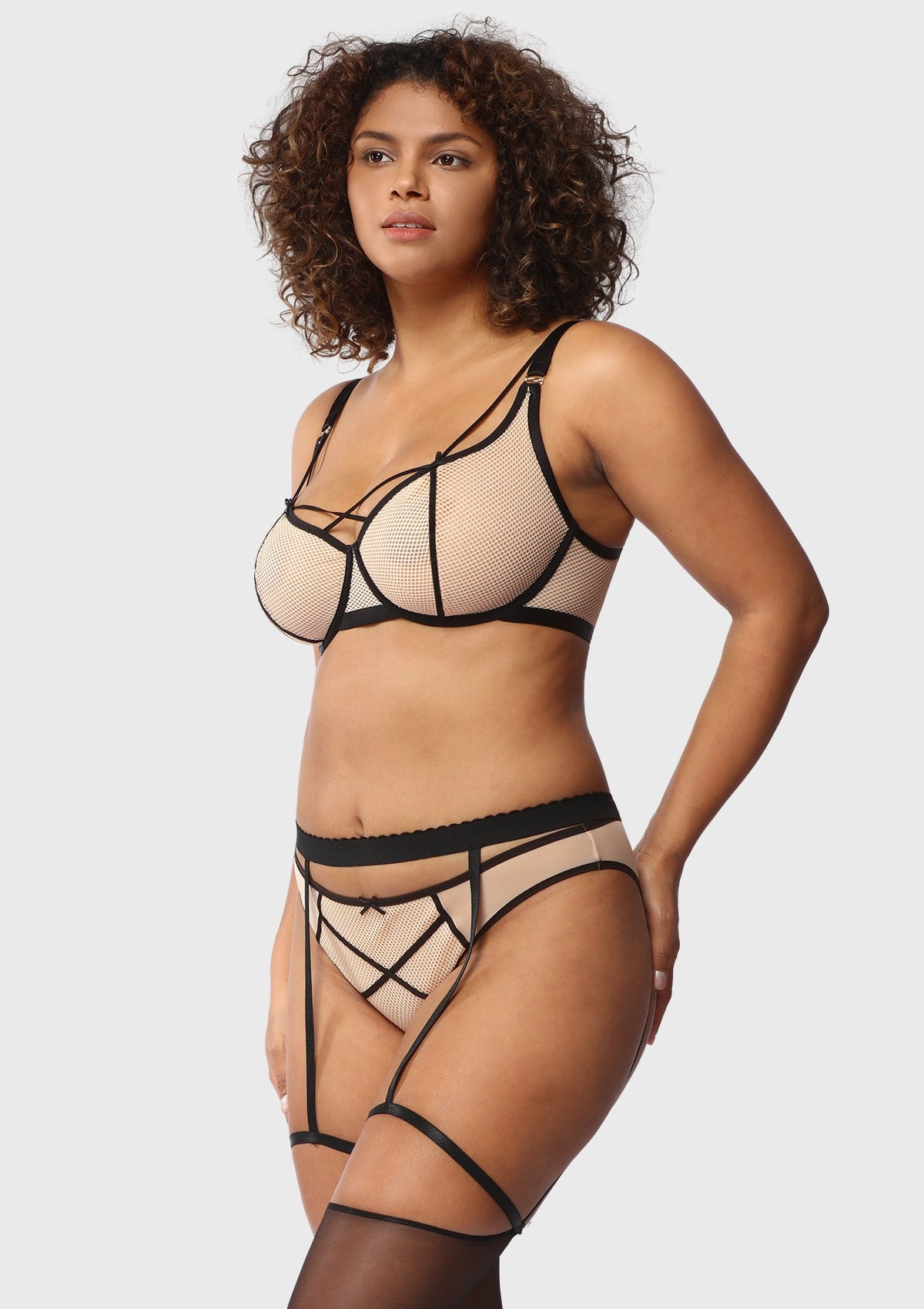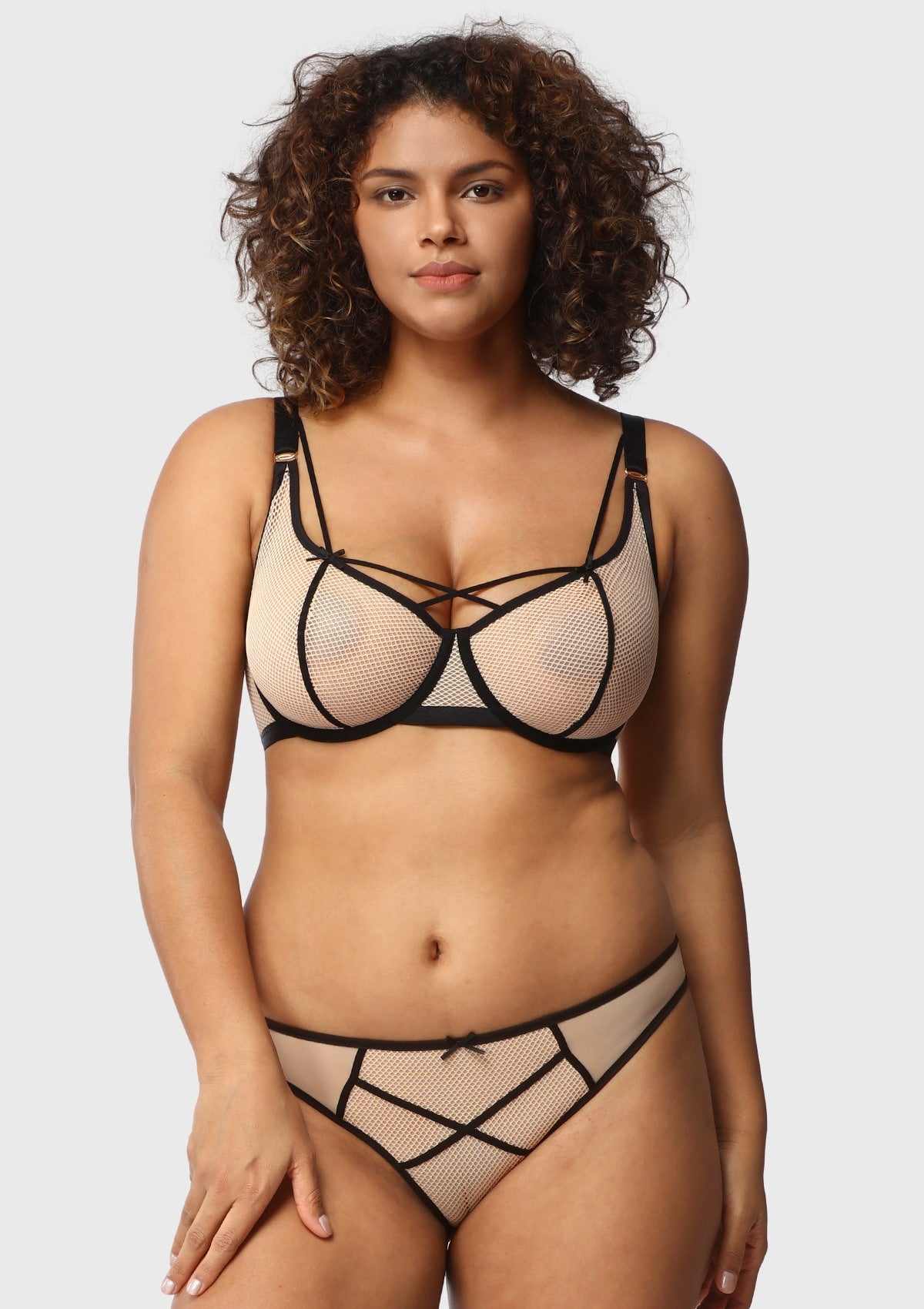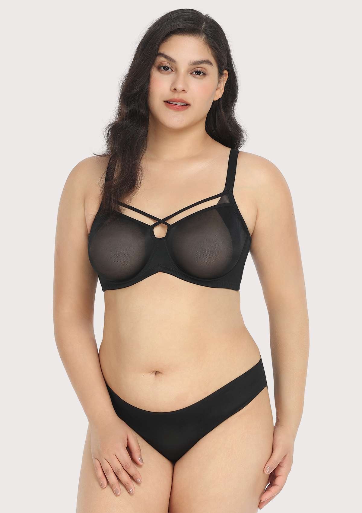 Billie Cross Front Strap Black Smooth Sheer Mesh Underwire Bra Set 0525