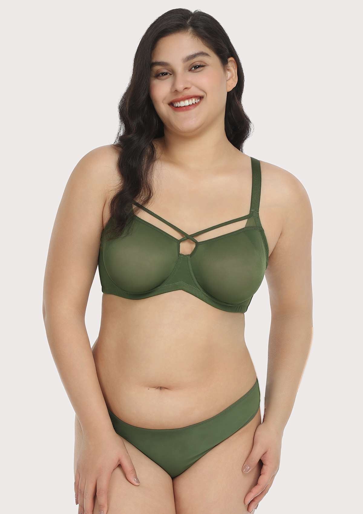 Billie Cross Front Strap Dark Green Smooth Sheer Mesh Underwire Bra Set 0525
