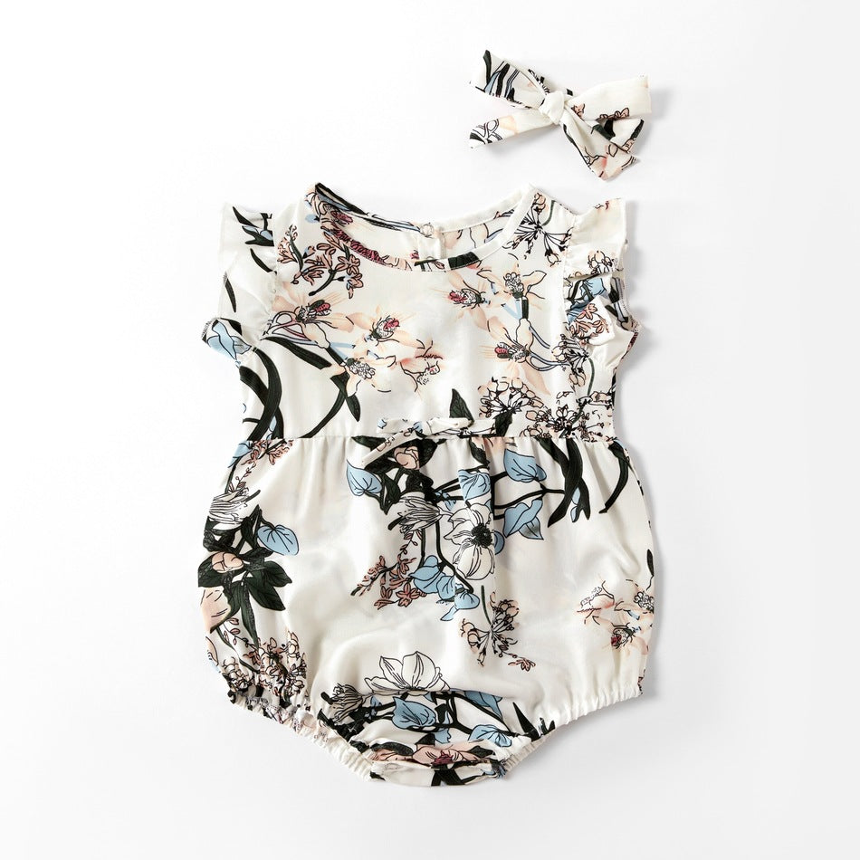 Floral Print White Cross Wrap V Neck Ruffle-sleeve Belted Romper for Mom and Me