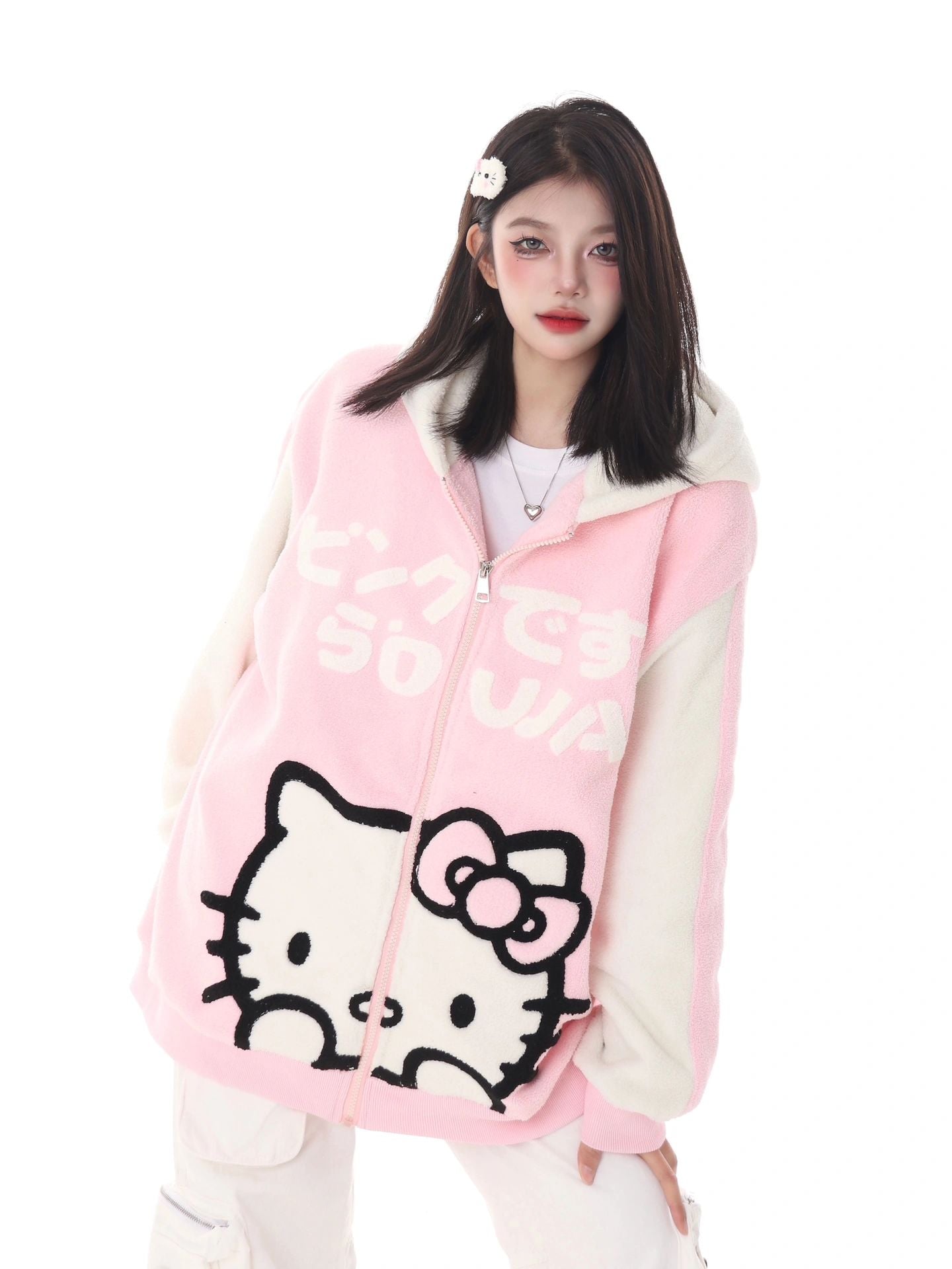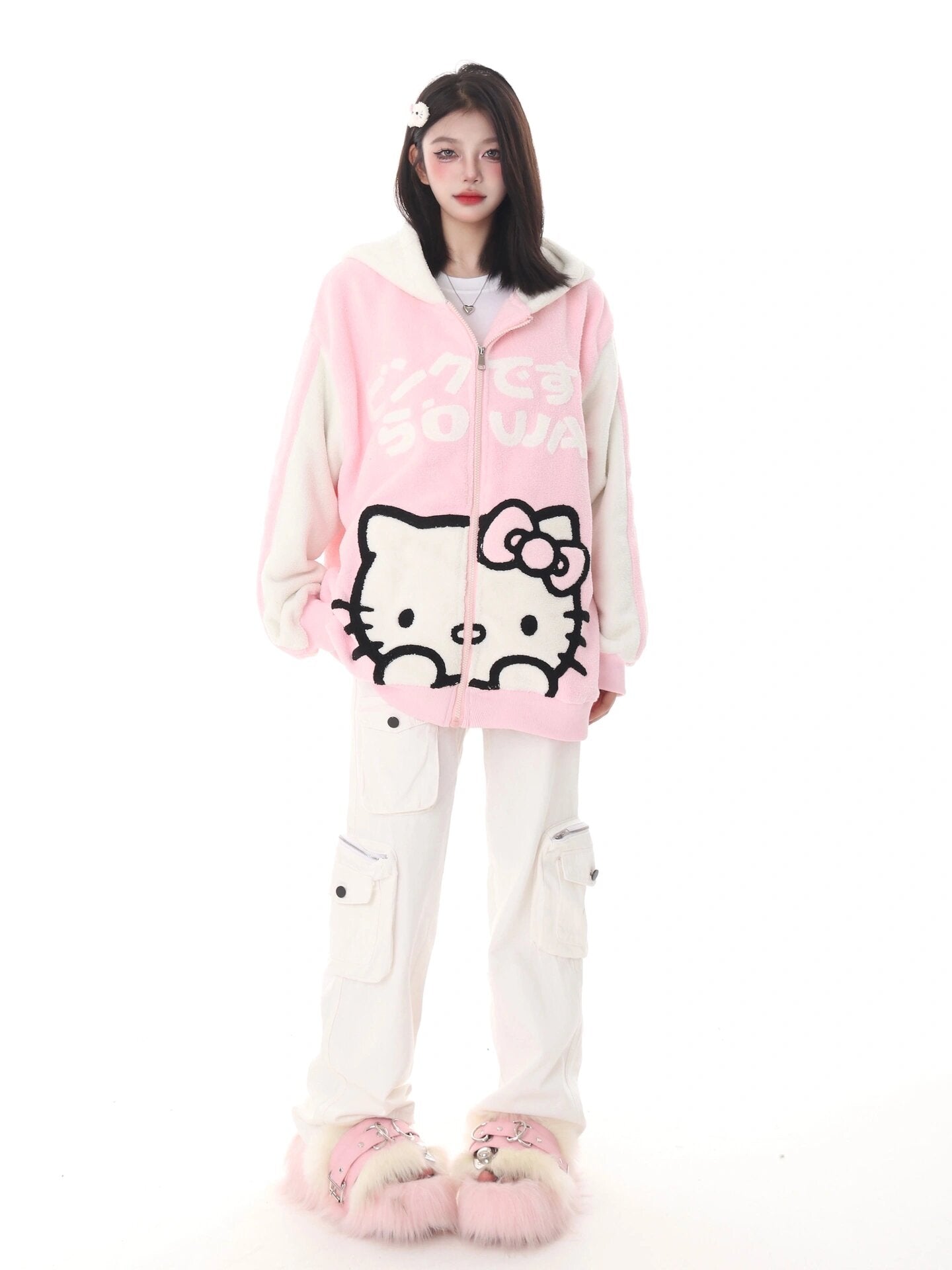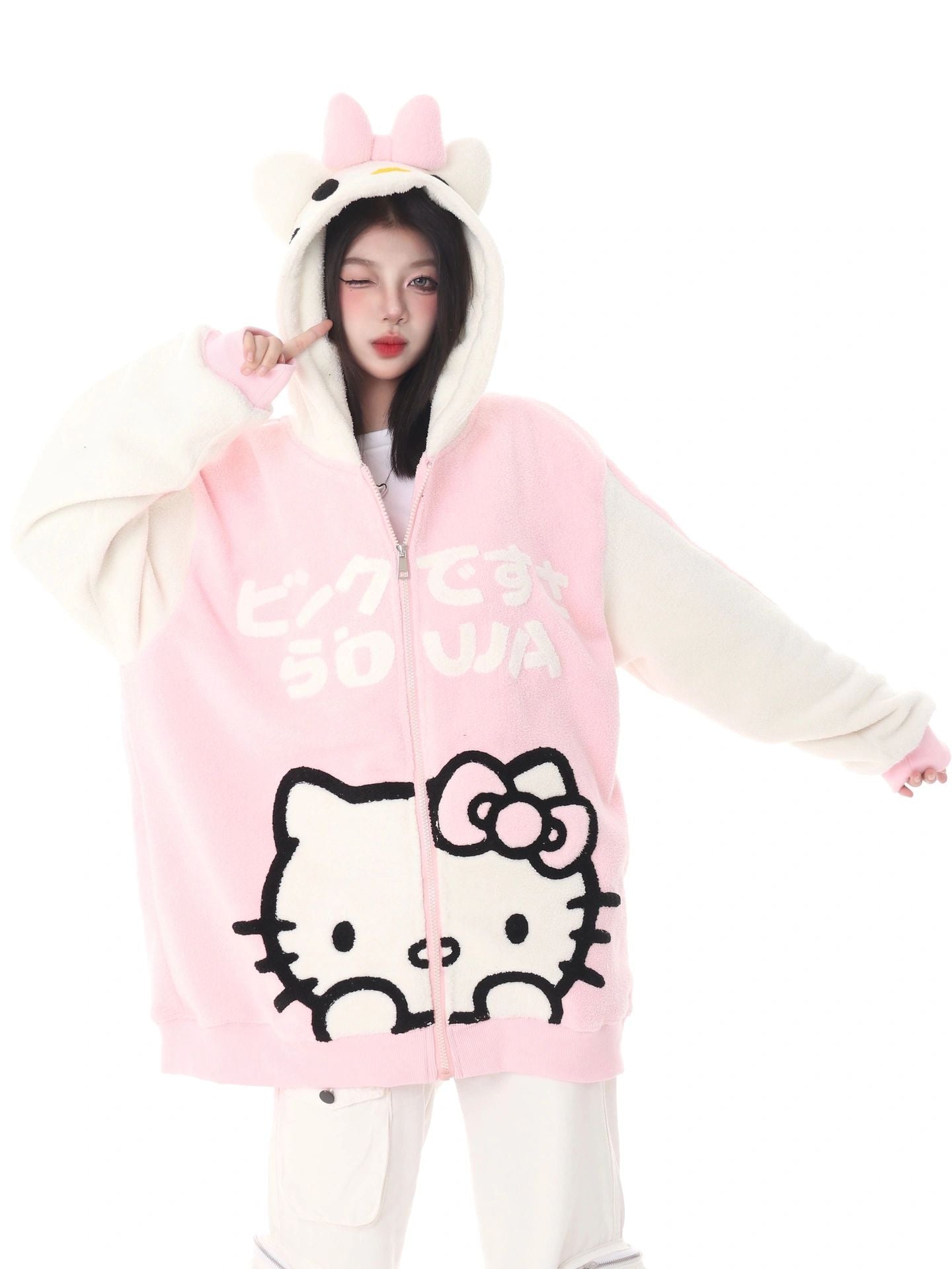 Hellokitty Teddy Jackets Fall Fashion Womens Teddy Coats Fleece Button Down Hooded Tops Warm Winter Outerwear with Pockets