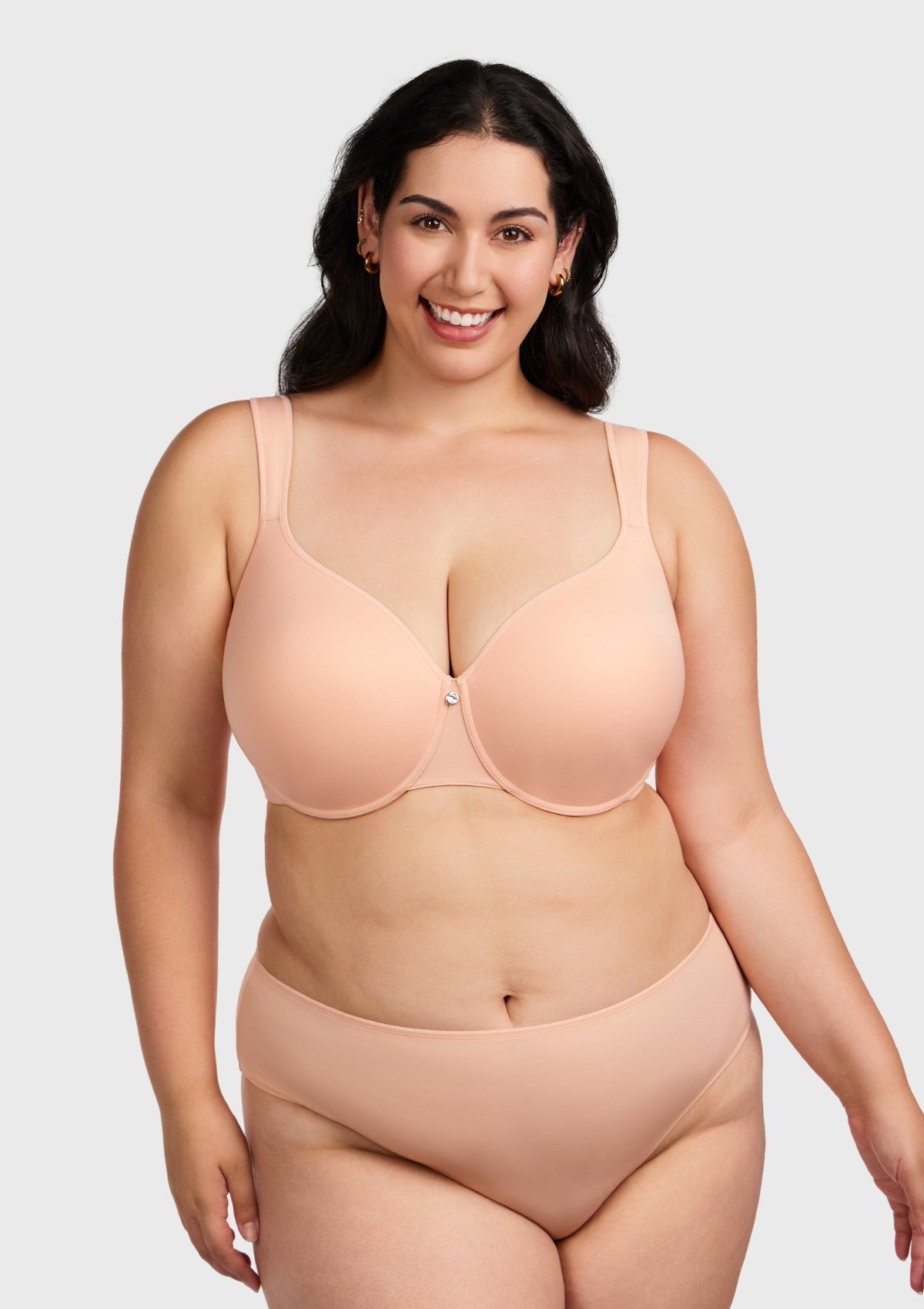 This set is a must-have addition to your lingerie collection. This set features a smooth, light pink T-shirt bra with lightly padded cups that provide a flattering minimized effect. The bra offers excellent support and shaping while remaining discreet under your favorite outfits. The set also includes matching panties for a complete and coordinated look. Made from high-quality materials, this bra set ensures all-day comfort and confidence.