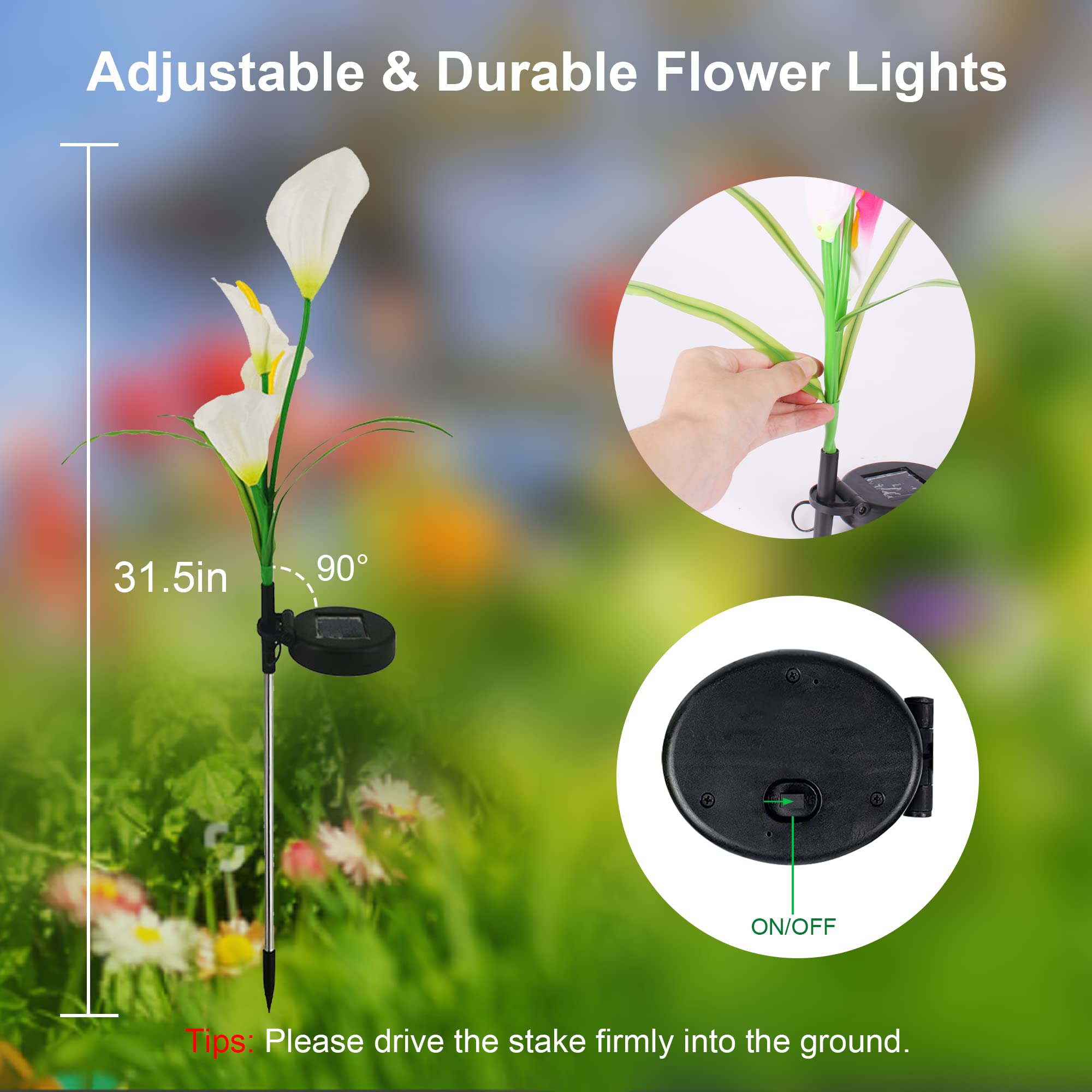 ADJUSTABLE DESIGN: The stem and leaves of the calla lily solar outdoor lights decorative can be adjusted manually, and you can freely adjust it to a suitable angle.