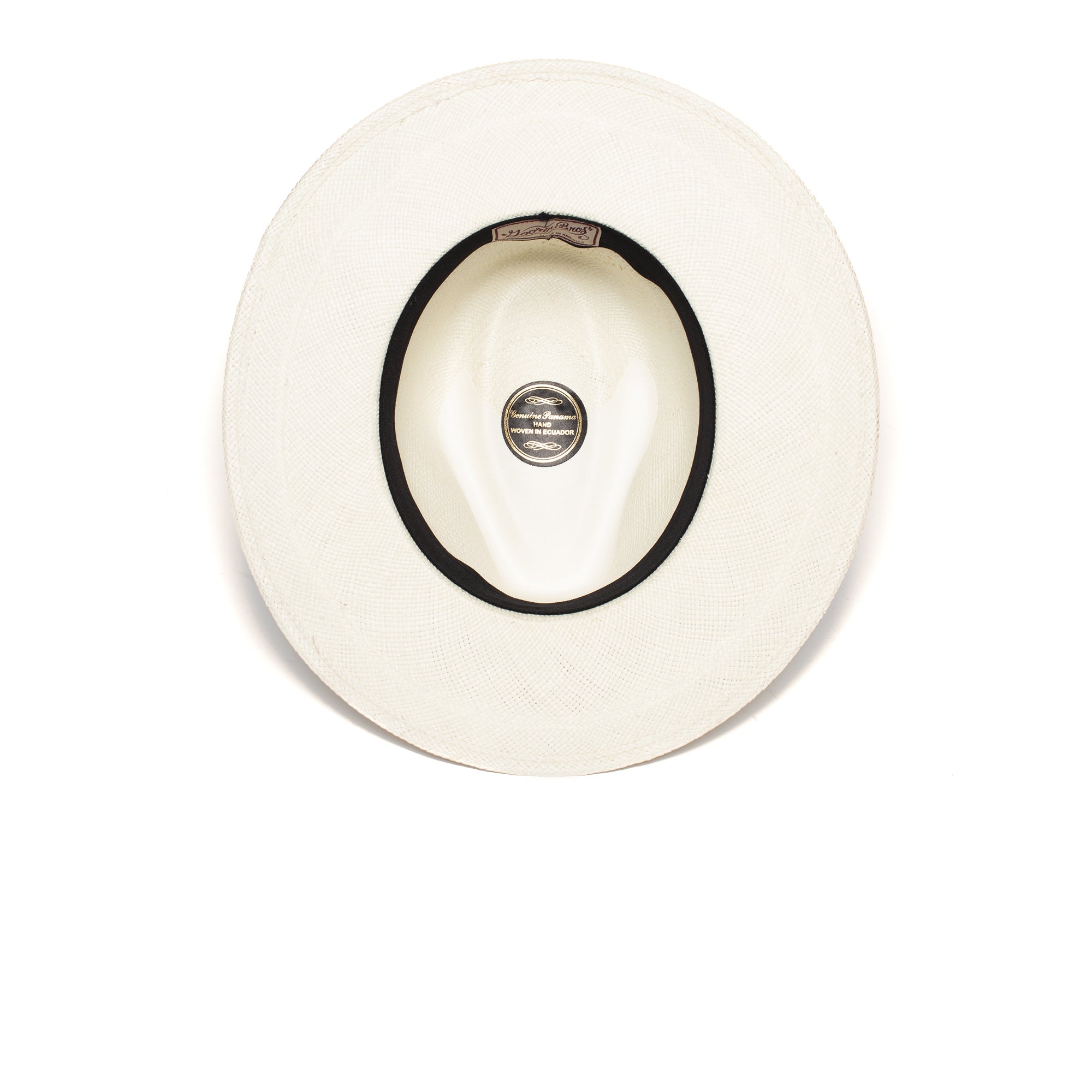 This Panama hat features a 3" center dent crown, 3" flat stiff brim, a leather hat band with hand tied knot and tails, and a German wicking sweatband.