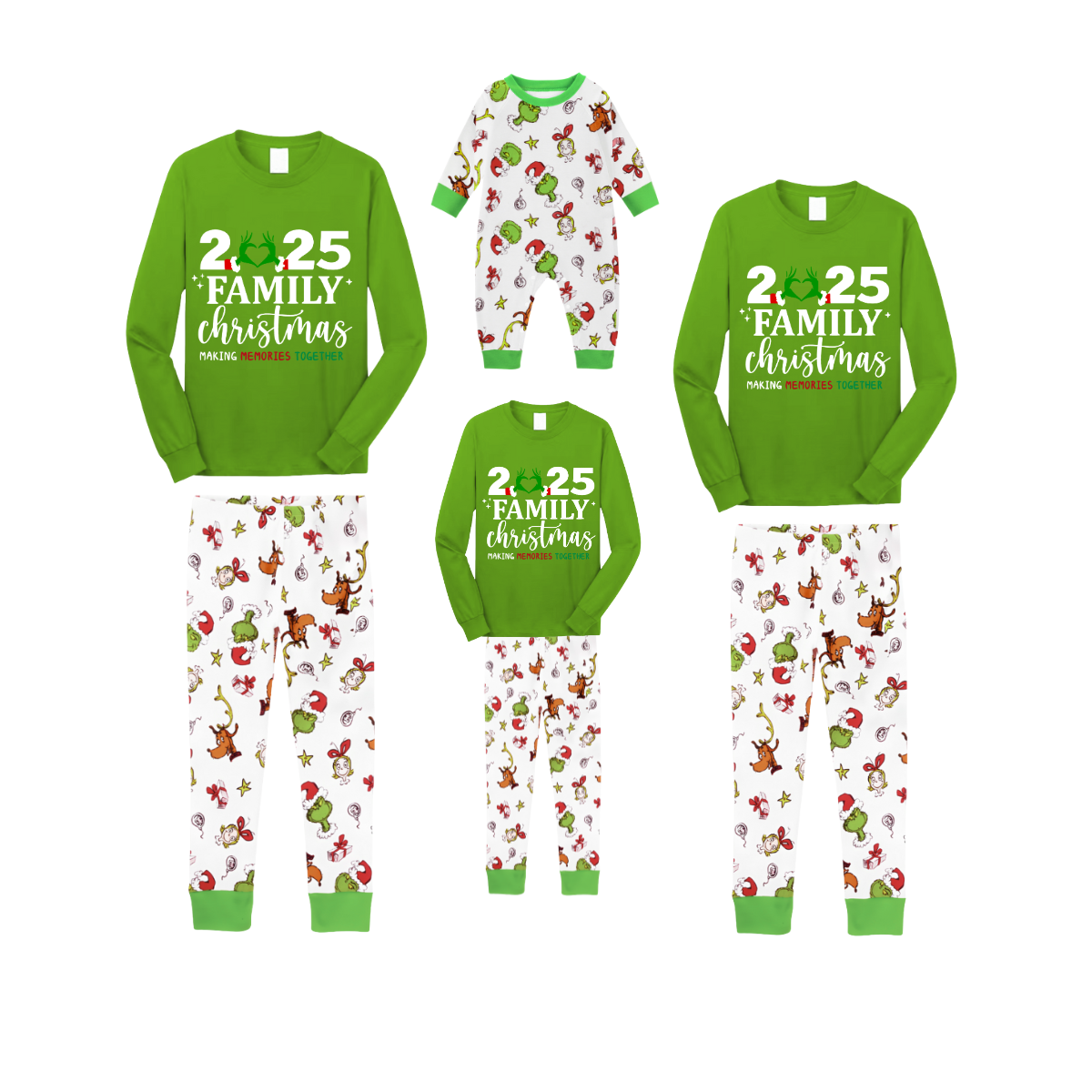 2025 Making Memories Family Christmas Family Pajamas Set - Green Top / Cartoon Animal Print Pants / Cartoon Animal Print Sleeves