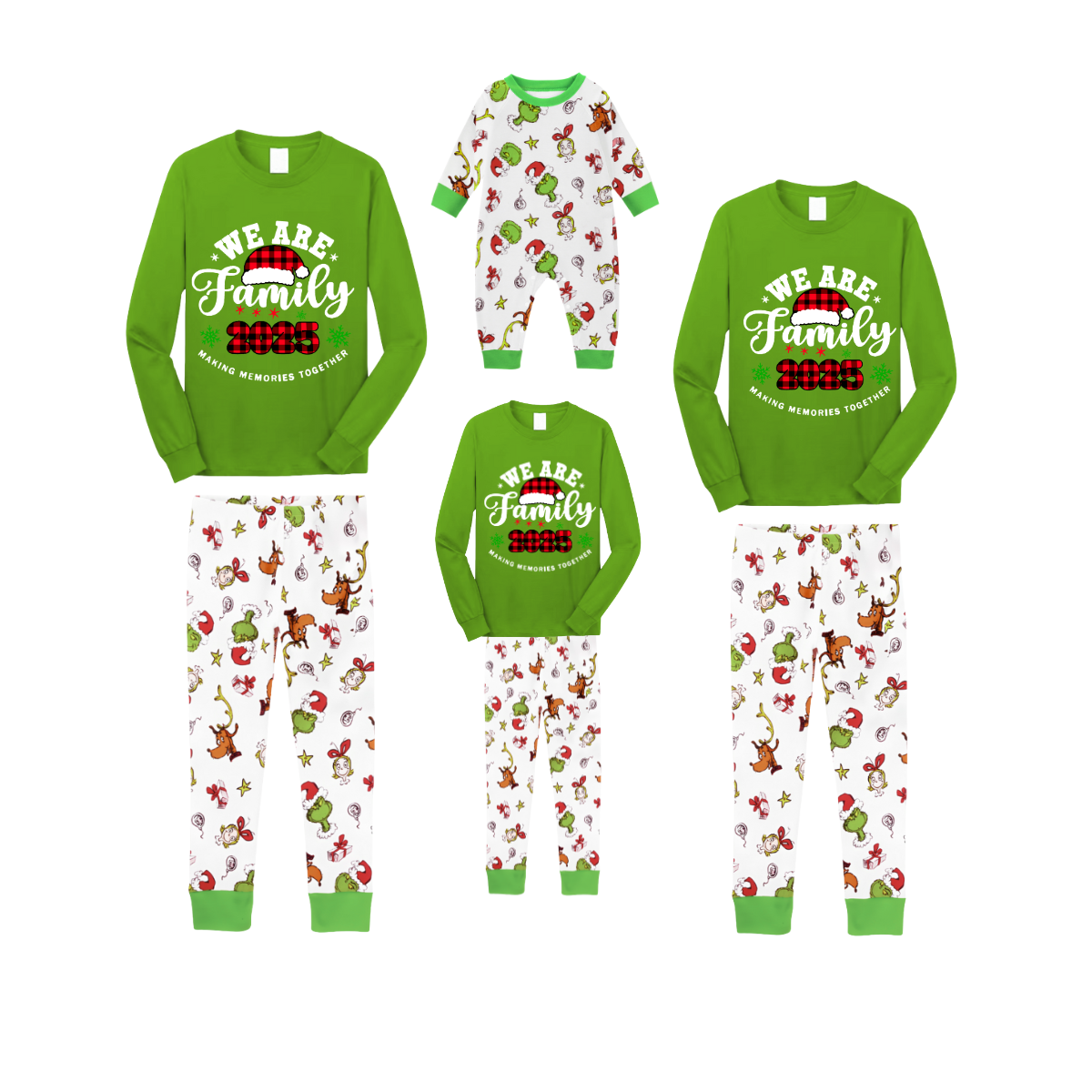 2025 We Are Family Christmas Family Pajamas Set - Green Top / White Animal Print Pants / White Animal Print Sleeves