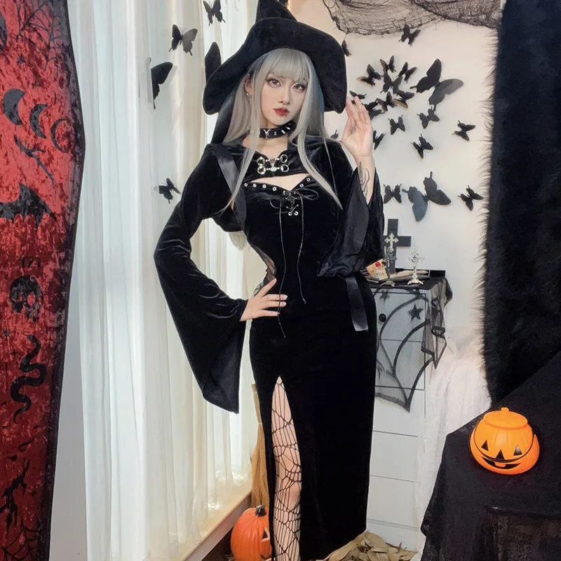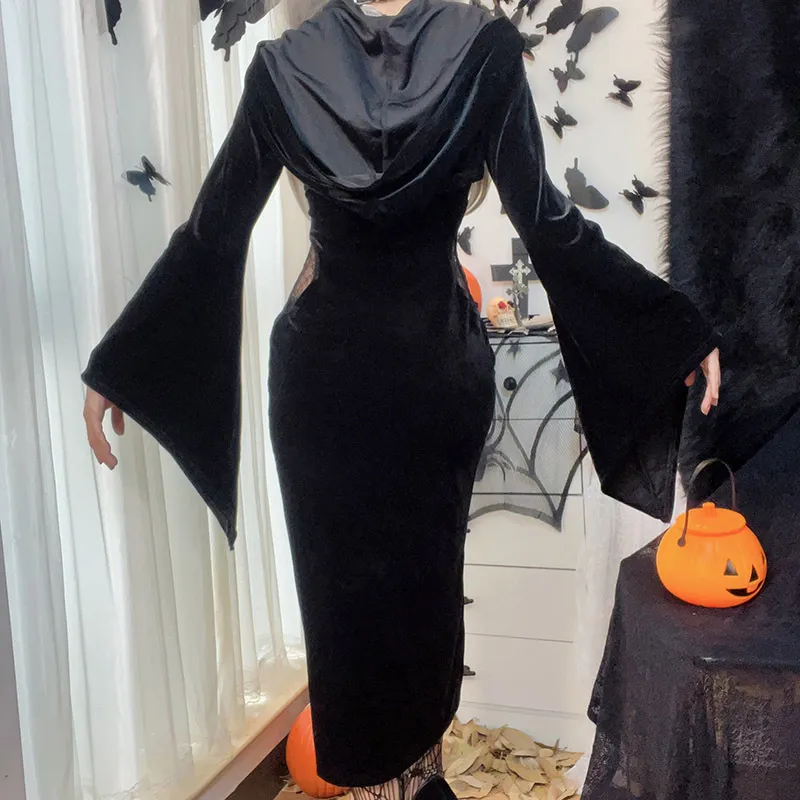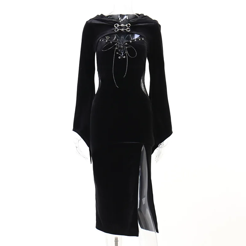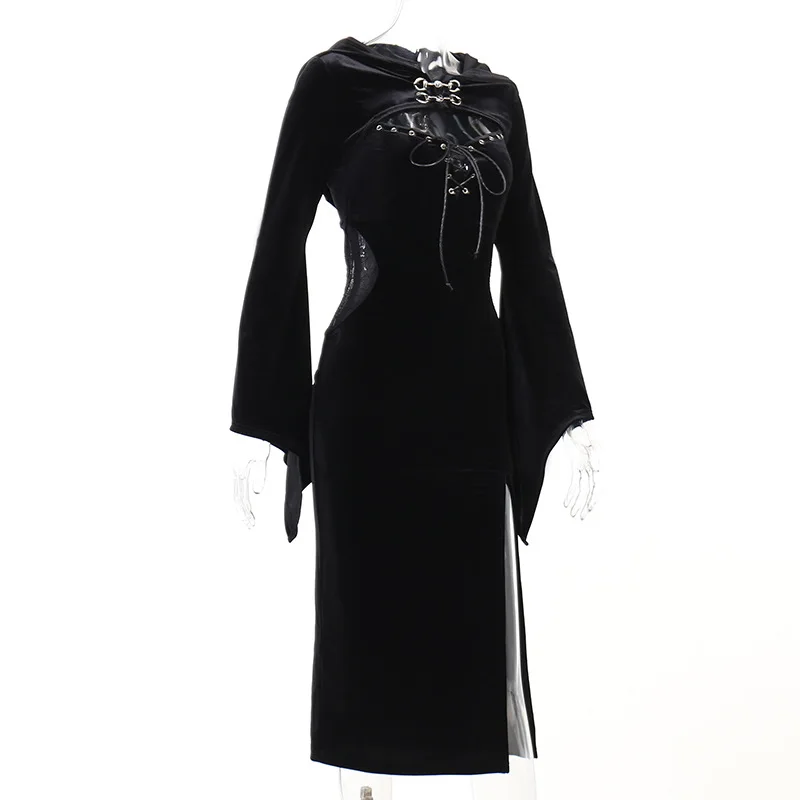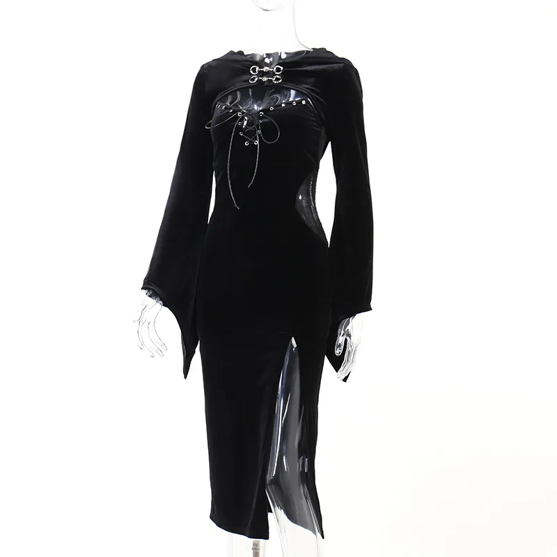 The Gothic Bandage Elegant Women High Split Flare Sleeve Dress is a striking and sophisticated piece inspired by gothic aesthetics. With its bandage design and high split detailing, this dress exudes a sense of allure and elegance. The flare sleeves add a touch of drama and flair, while the overall silhouette is both flattering and eye-catching.
