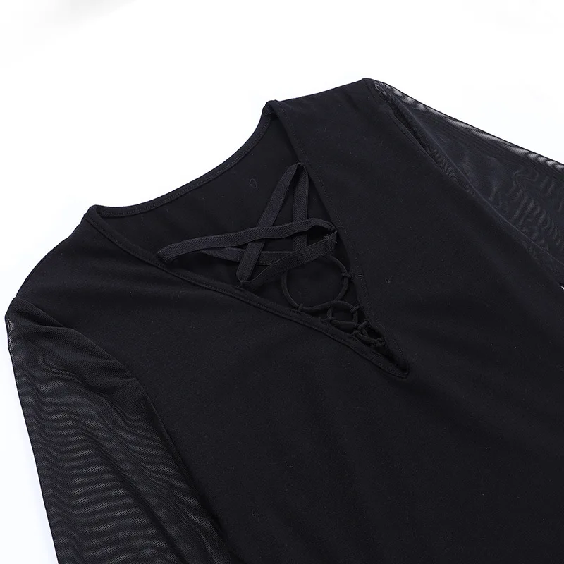 Crafted from high-quality materials, this dress has a unique high split design that adds a modern touch to its gothic appeal. The mesh splice details add intricate and delicate elements, while the soft fabric brings a luxurious texture and depth to the overall design.