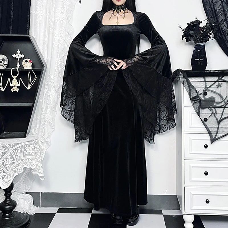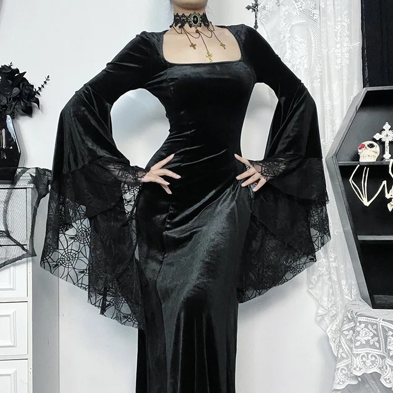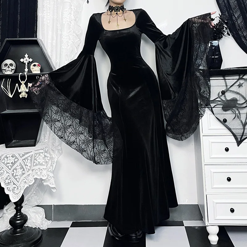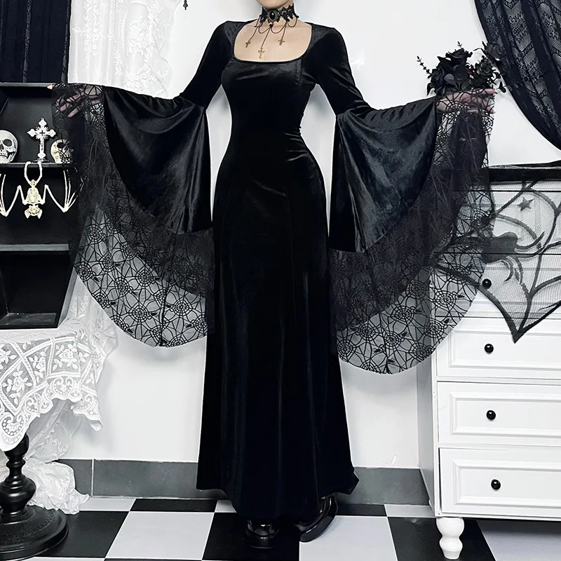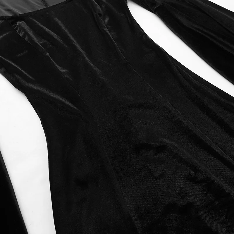 Crafted from high-quality materials, this dress is both comfortable and stylish. The black color palette ensures versatility and timeless elegance, making it suitable for various occasions and events. Whether you're attending a gothic-themed party or a formal dinner, this dress is sure to make a statement.